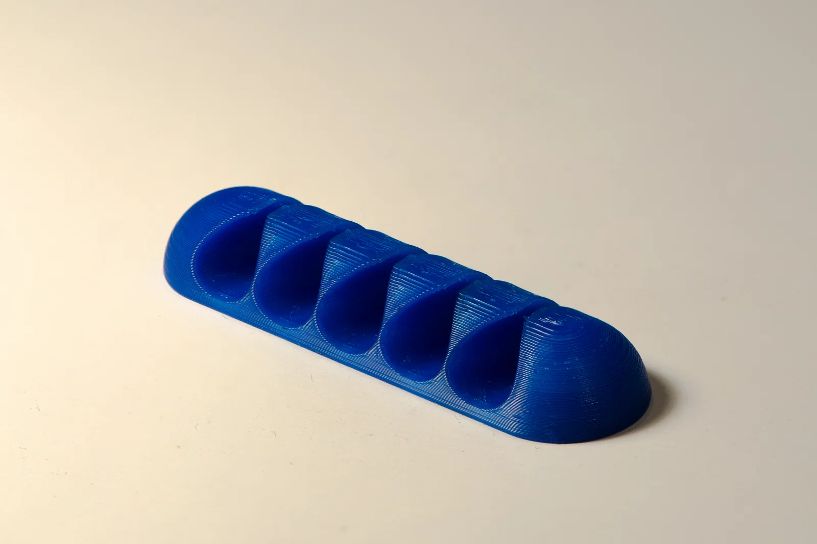 Kẹp giữ dây cáp được thiết kế để in bằng vật liệu dẻo. Lỗ luồn dây là dạng bất đối xứng (một đầu rộng và đầu kia hẹp).