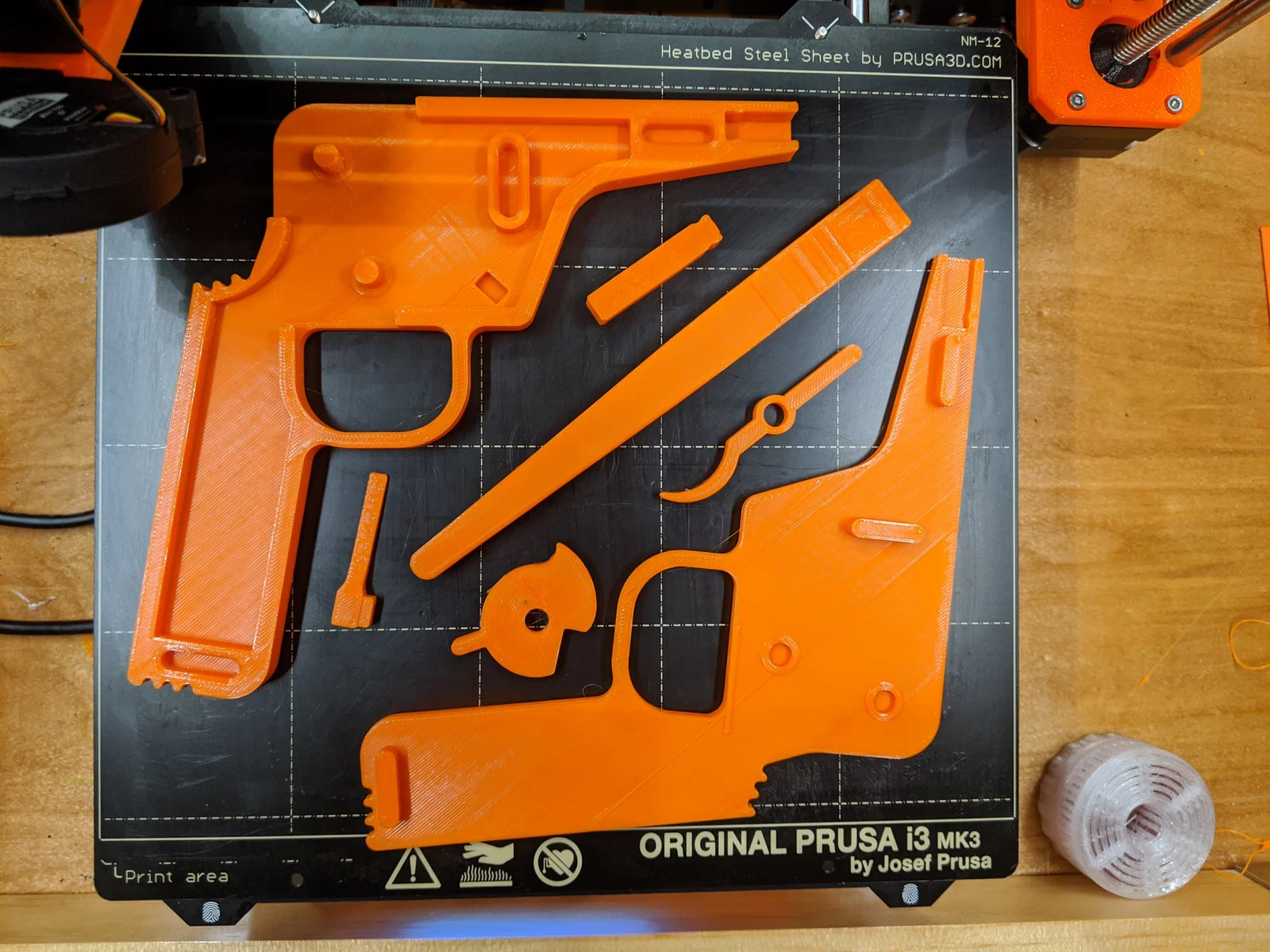 Tất cả chi tiết đều vừa trên build plate của MK3. PLA và PETG đã được thử và hoạt động tốt, nhưng các loại nhựa khác cũng có thể dùng được. PETG có thể cần supports vì có một số phần overhang.