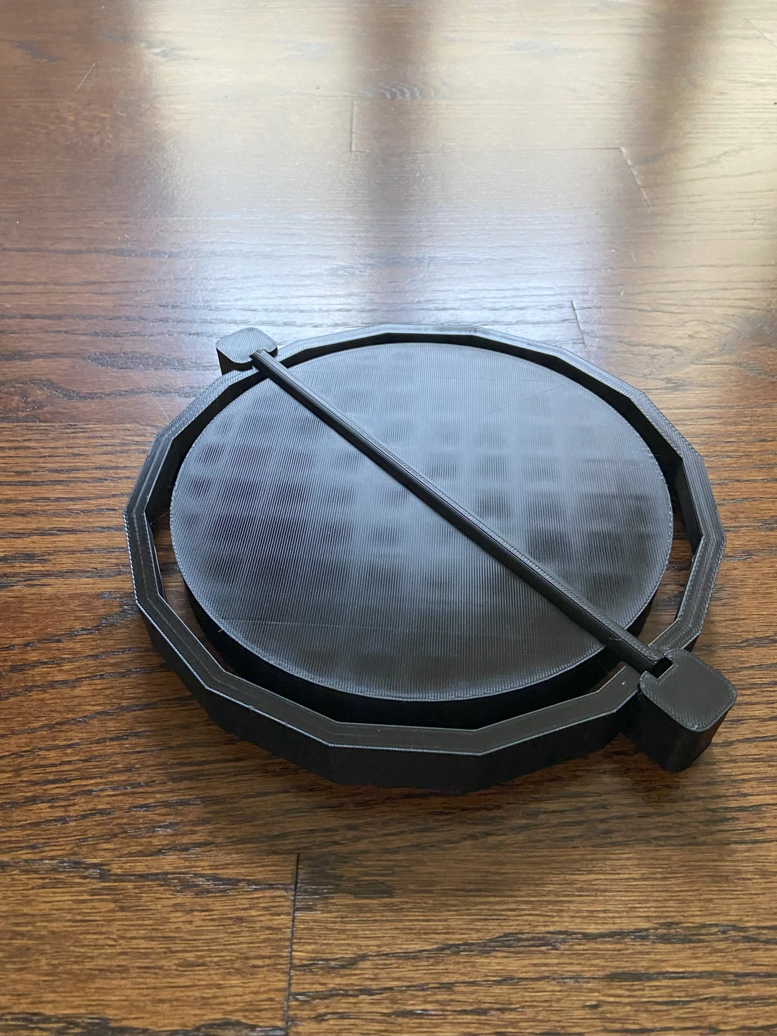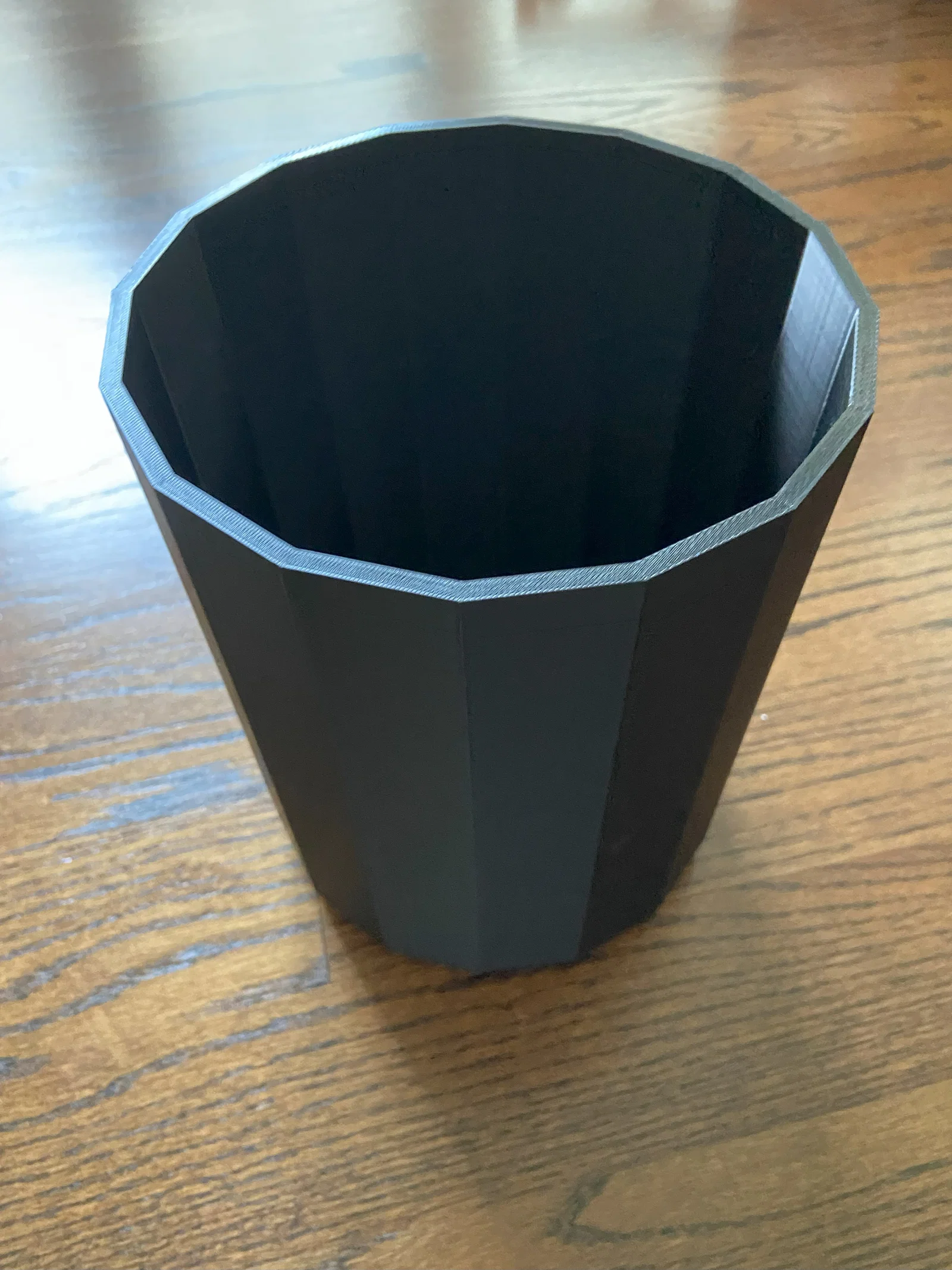 Đây là một thùng rác, được in bằng Overture Black PLA. Kích thước là 180 mm x 180 mm x 230 mm, và có chu vi ngoài 565.2 mm. Nắp có thể xoay và quay rất trơn. Phần quay của nắp cũng có thể búng/nhấc ra khỏi khung nắp.