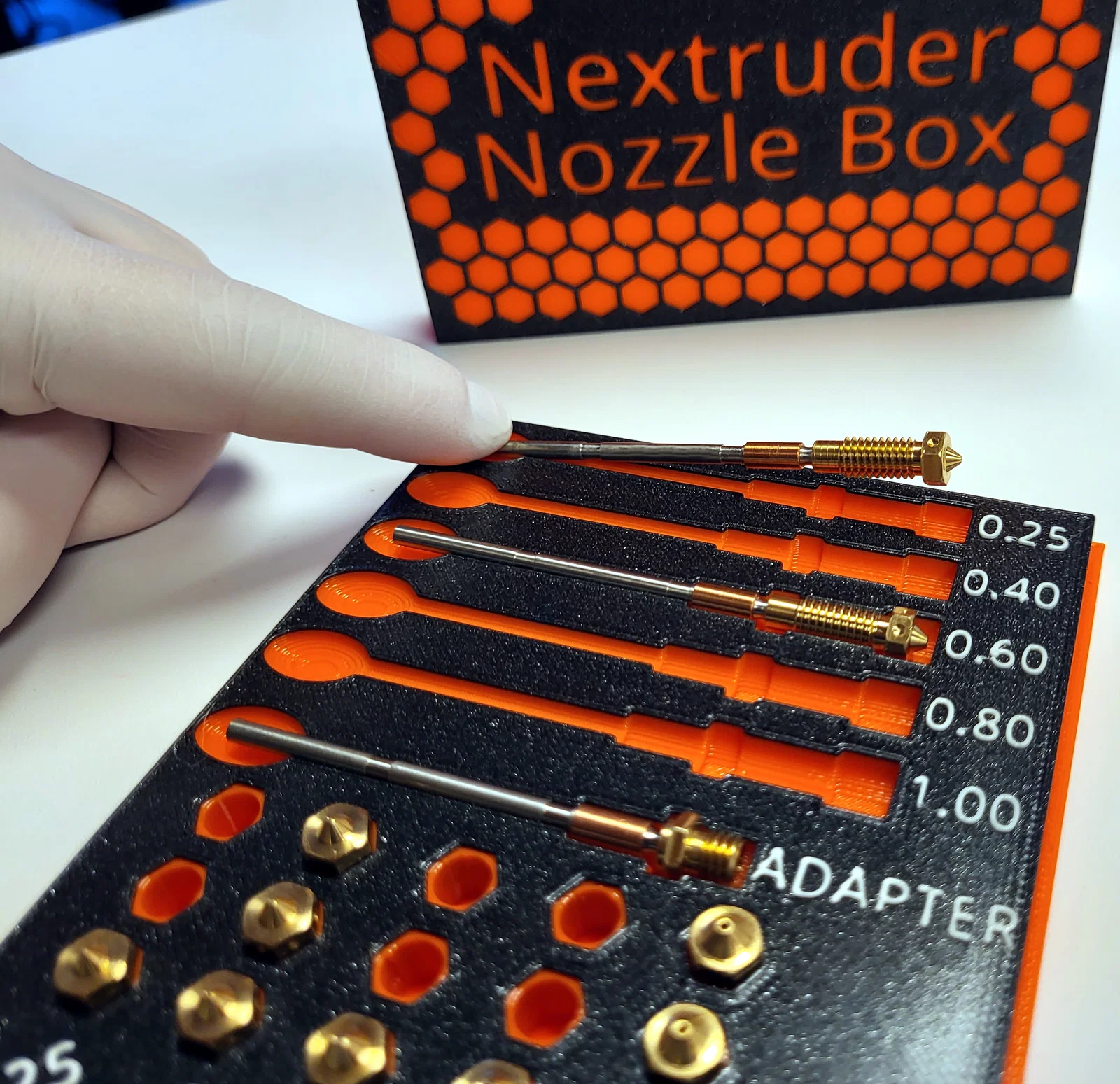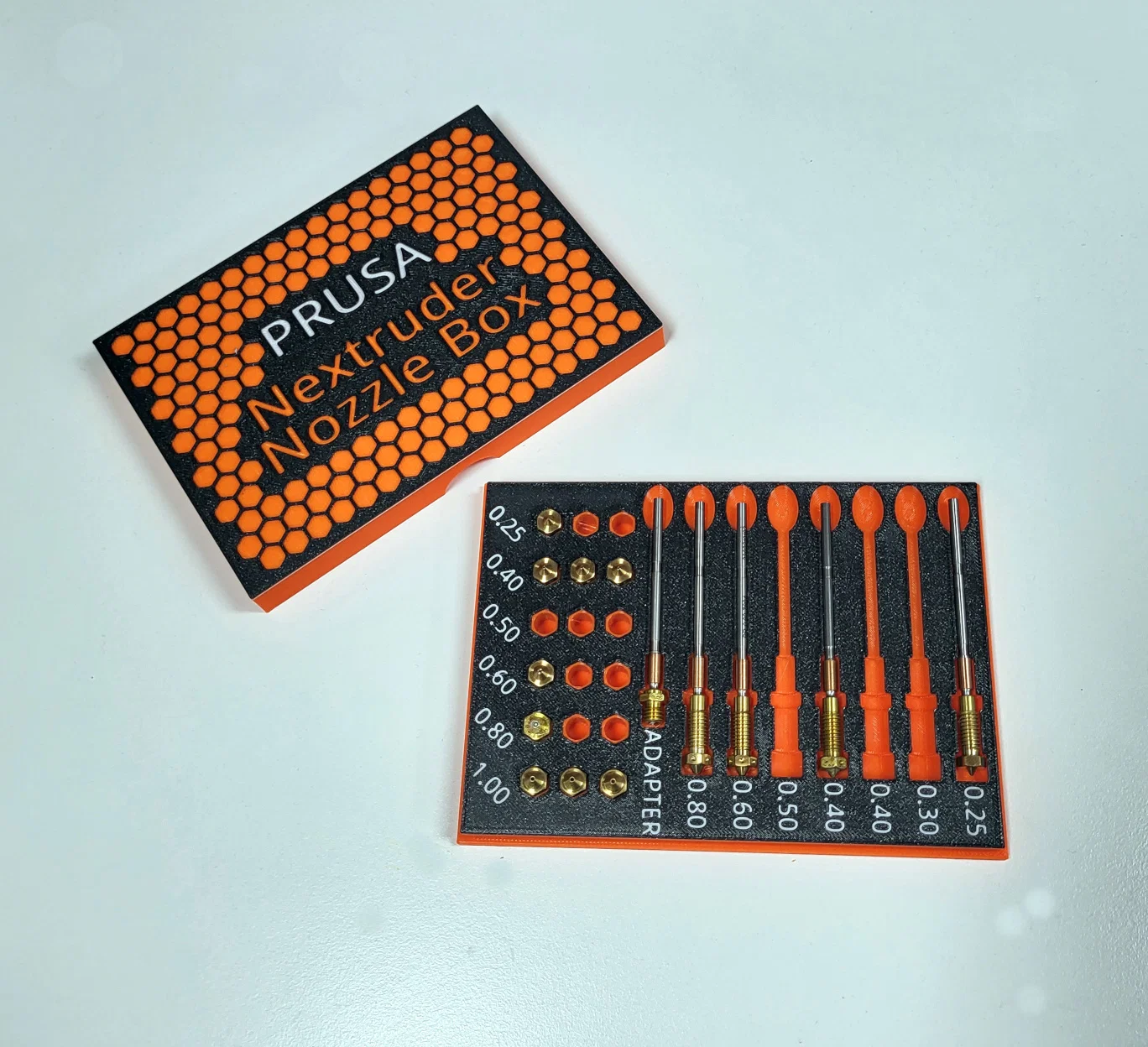 Hộp đựng gọn gàng cho nozzle Prusa Nextruder, kèm chỗ để adapter Nextruder V6 và cả nozzle V6 (tuỳ phiên bản). Có nhiều bản cập nhật kích thước 0.25–0.80mm, có khay dễ lấy và nắp giữ nozzle.