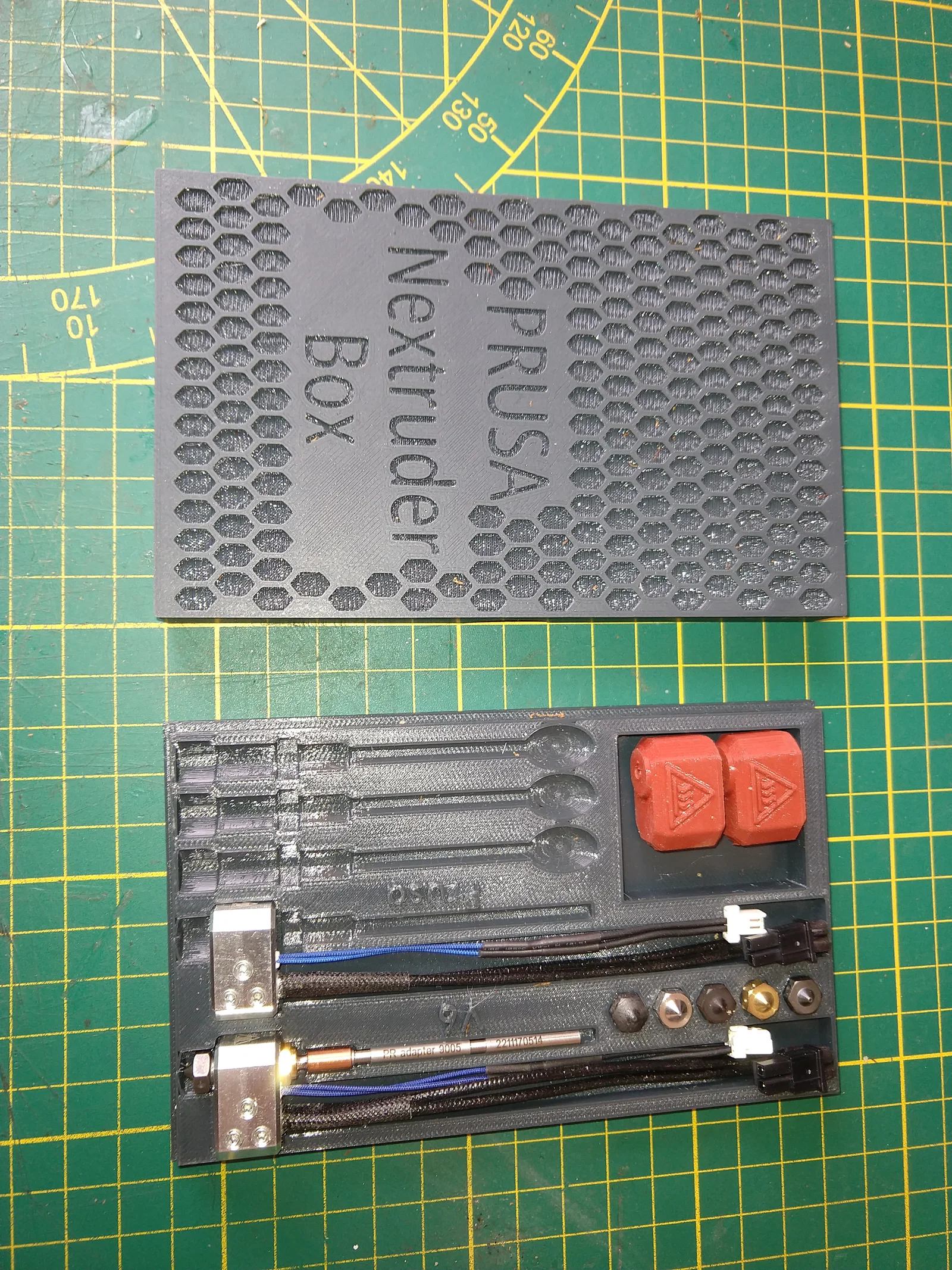 Hộp có chỗ để 2 bộ hotend MK4 đầy đủ, thêm vài nozzle, 3 Prusa Nozzle và silicone sock.