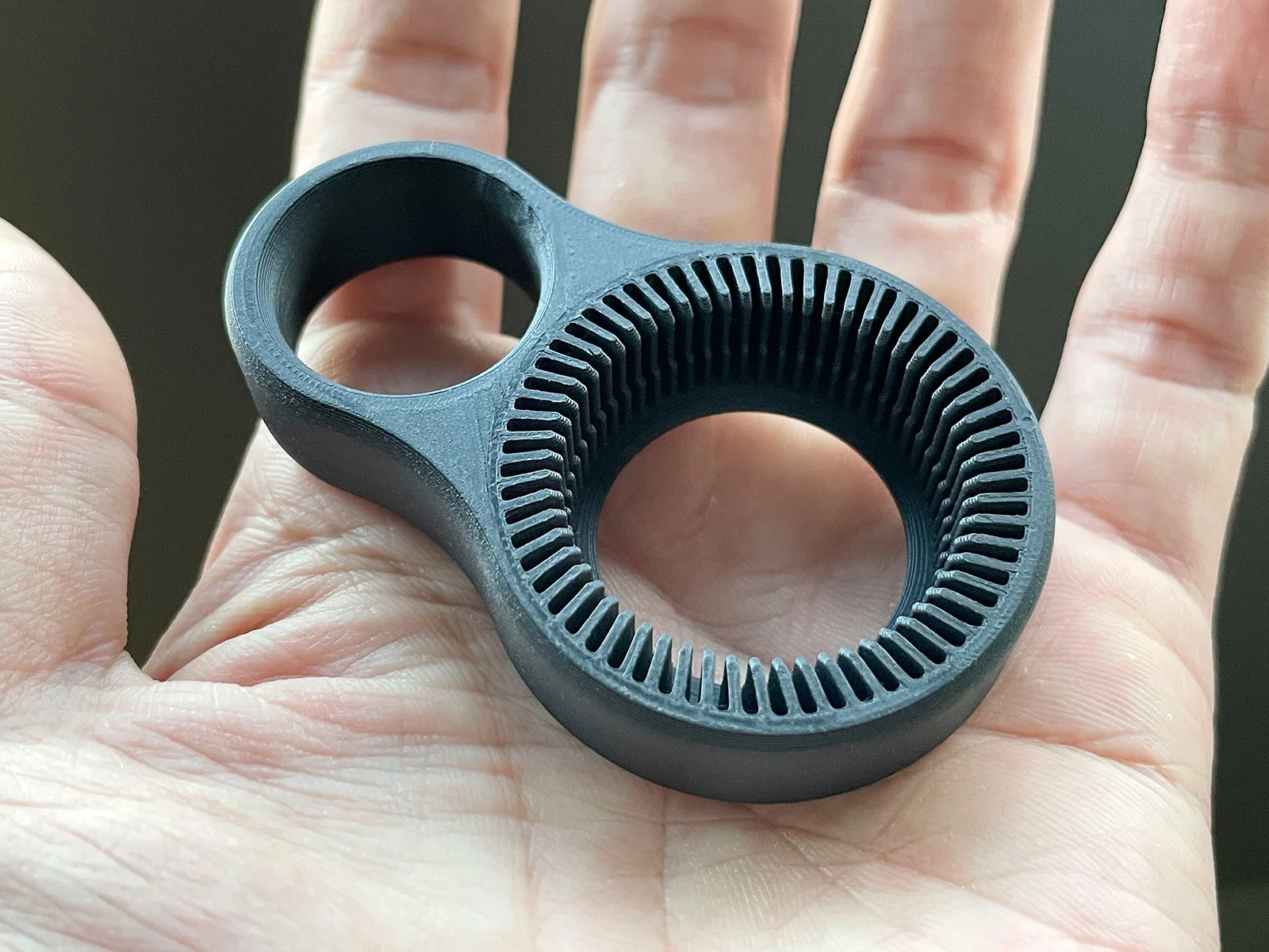 Thiết kế vòng đôi giúp vặn/mở nắp chai nhựa/PET dễ hơn, tối ưu cho cỡ nắp phổ biến khoảng 30mm. Có 5 size lỗ cho nắp (lỗ ngón tay 22mm); nên in thử size 03-Medium trước rồi đổi size nếu chưa vừa.