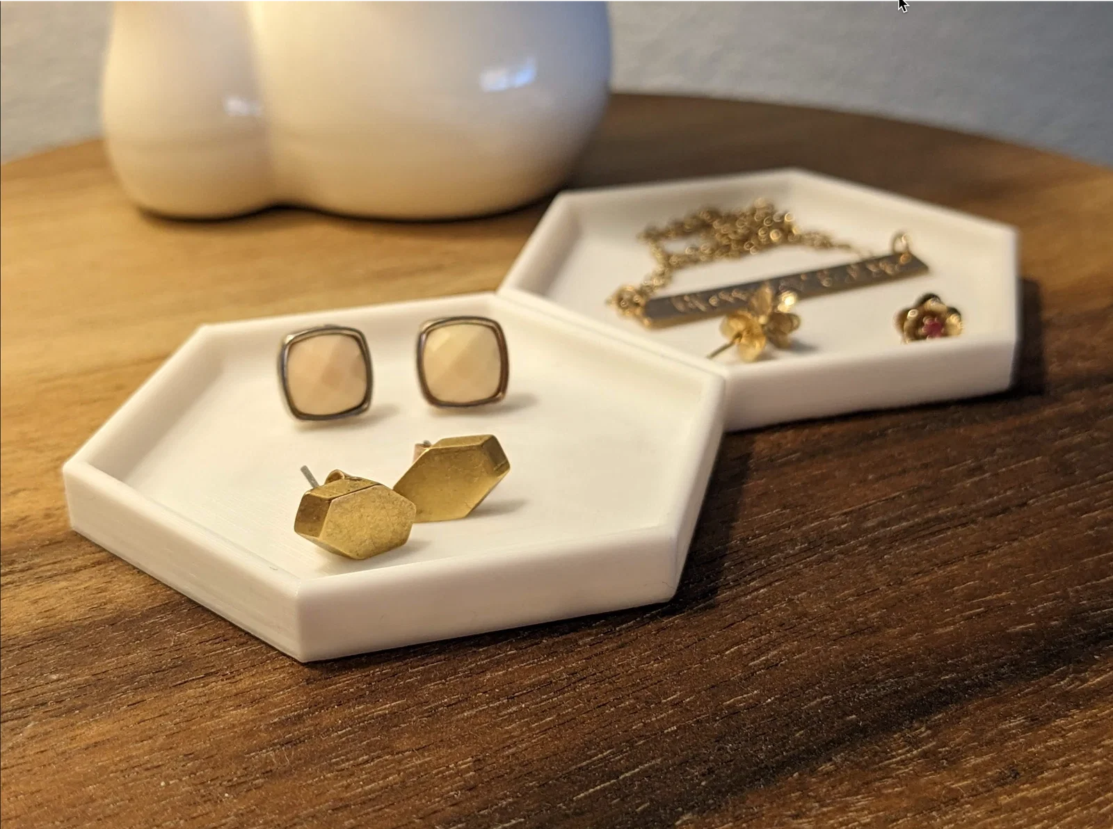 Việc sử dụng khay in 3D giúp bạn tùy chỉnh màu sắc theo sở thích cá nhân, dễ dàng phối hợp với tông màu phòng ngủ hoặc phòng tắm. Thiết kế hình lục giác không chỉ đẹp mắt mà còn rất thuận tiện khi bạn muốn ghép nối nhiều khay lại với nhau thành một tổ hợp lưu trữ lớn hơn. Bề mặt nhẵn mịn và viền khay vừa phải giúp giữ cho các vật dụng nhỏ không bị rơi rớt ra ngoài, đồng thời vẫn đảm bảo bạn dễ dàng lấy đồ khi cần. Sản phẩm này cực kỳ hữu ích cho những ai thường xuyên quên mất chỗ để bông tai hay hay tìm kiếm kính mắt mỗi sáng thức dậy.