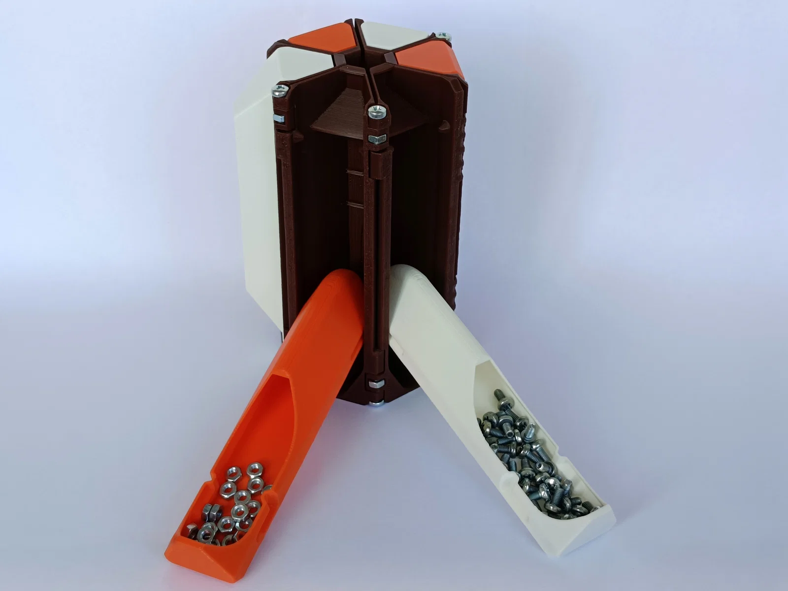 Organizer mô-đun dạng đứng gồm 6 Segment ghép thành hình lục giác. Có thể print-in-place hoặc in rời để lắp lại; nhiều kiểu Container cho đồ nhỏ như ốc M3–M5, linh kiện, chi tiết mô hình. Có file .step để tùy biến.