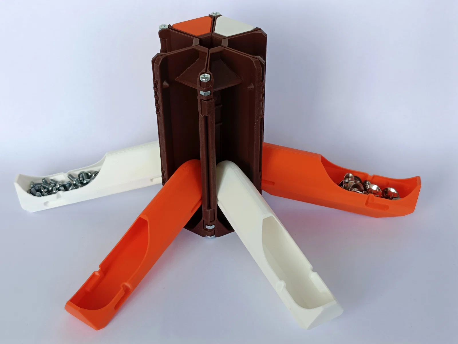 Bạn có thể in nguyên cả Organizer dạng print-in-place (dùng file HexOrganizerFull.stl hoặc Hex6Segments.stl), hoặc in theo cụm 1, 2 hay 3 Segment đã nối sẵn (dùng file HexSegmentScrews.stl, Hex2SegmentsScrews.stl hoặc Hex3SegmentsScrews.stl).