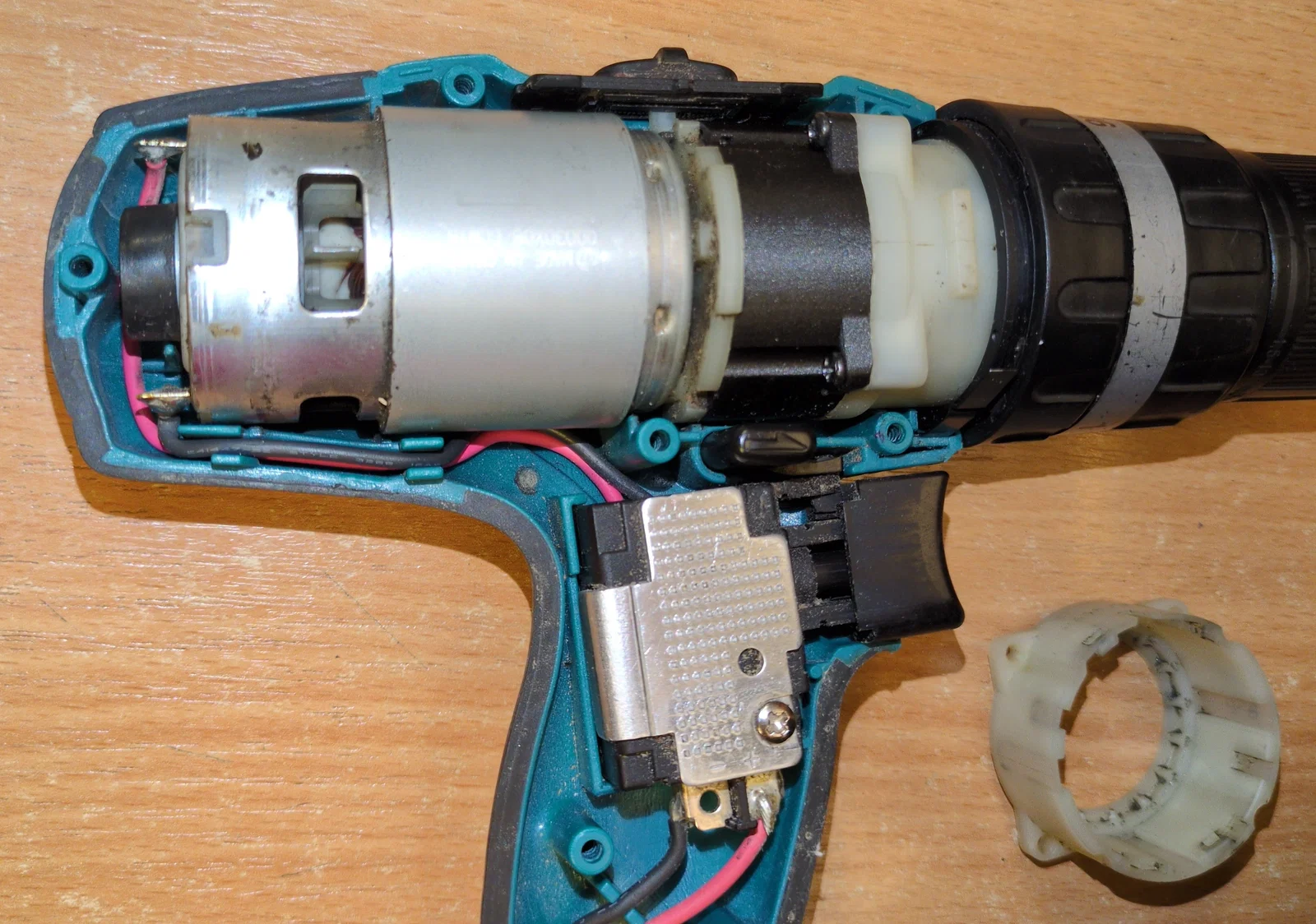 Cơ cấu đổi tốc độ dựa vào một clutch để khóa ring gear. Các răng của chi tiết nhựa dùng để khóa ring gear đã bị mòn hết.