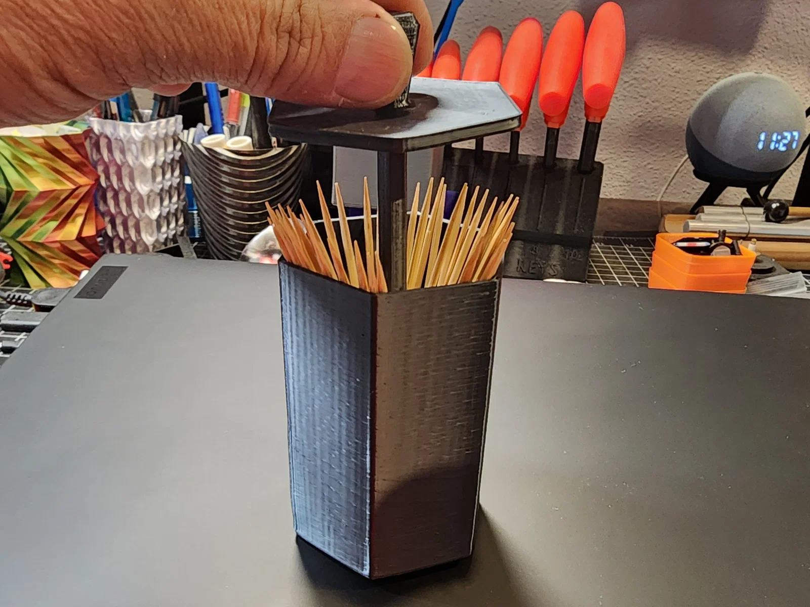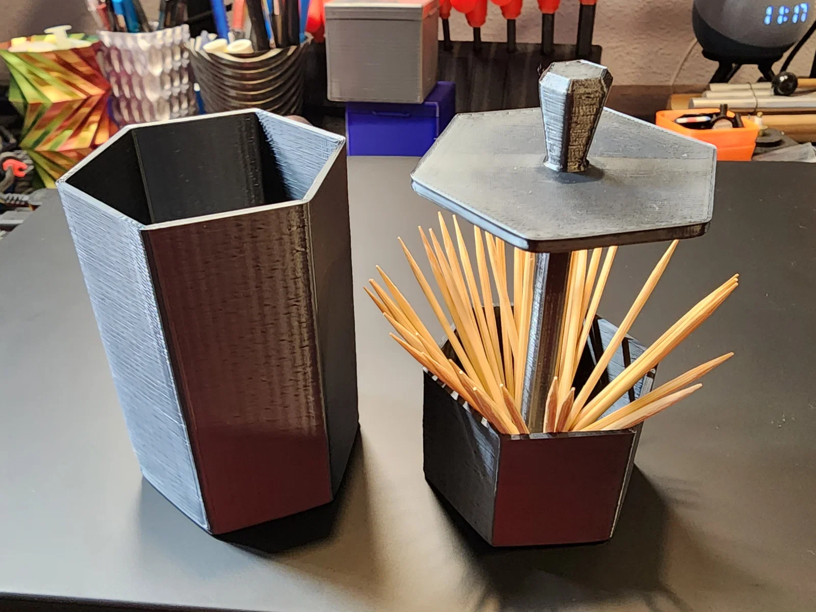 Cách gọn gàng để cất và nhả tăm với thiết kế lục giác (Hexagonal) hiện đại. Cơ chế nắp trượt đóng chậm “slow-motion”, chứa tối đa 150 cây tăm. Có gợi ý in PLA/PETG, brim, support và lắp ráp.