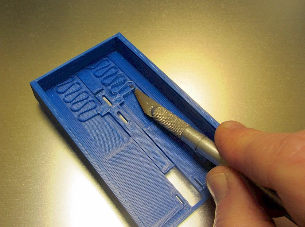Đầu tiên dùng dao X-acto nhẹ nhàng tách các tab và phần lò xo ra khỏi phần còn lại của nắp trên. Sau đó tháo các support tích hợp ở khe đẩy thẻ ra. Lấy các leaf spring và ấn vào đúng vị trí trong các rãnh ở phần đáy. Tiếp theo, ấn miếng che khe (slot cover) vào. Cuối cùng, ấn miếng nút (button) vào đúng chỗ. Nút không hoàn toàn đối xứng, nên canh hướng sao cho nút có hành trình (travel) lớn nhất.