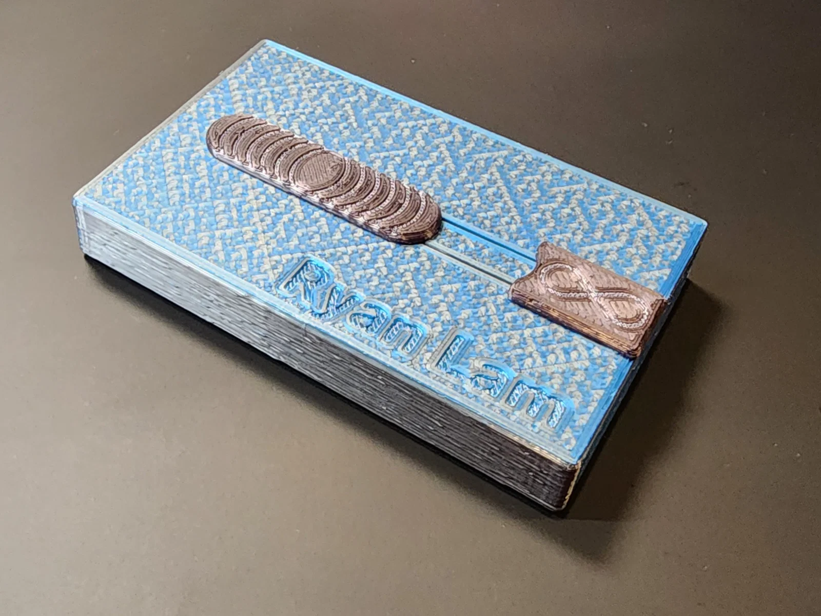 - Hoa văn bạn thấy trong hình là do dùng infill “Hilbert Curve” cho lớp đáy (lớp đầu tiên). Kết hợp với filament silk PLA 2 màu (dual-extruded) sẽ tạo hiệu ứng màu xen kẽ theo họa tiết Hilbert, nhìn khá hay.