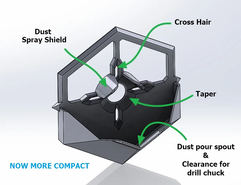 Bộ hứng bụi khi khoan #0108 thiết kế lục giác, tổng hợp những điểm mạnh từ nhiều mẫu dust collector trên Printables. One-piece, có spray shield, lỗ khoan taper, miệng rót, gọn, in không cần supports, kèm file STEP.