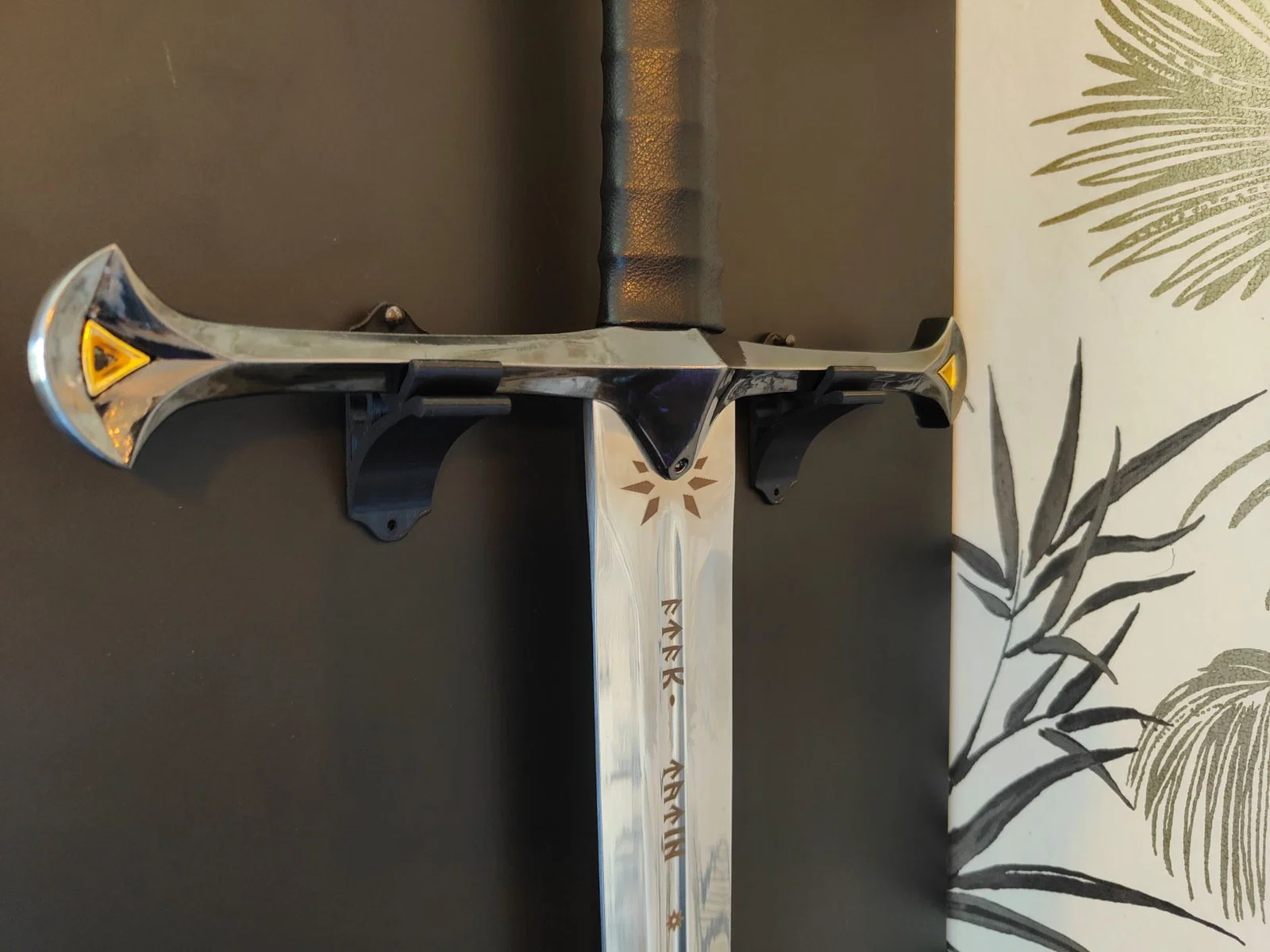 Giá treo tường được thiết kế để vừa với bản replica thanh kiếm Narsil / Anduril trong LOTR. Dùng bộ này thì kiếm sẽ được treo lơ lửng, không chạm vào tường.