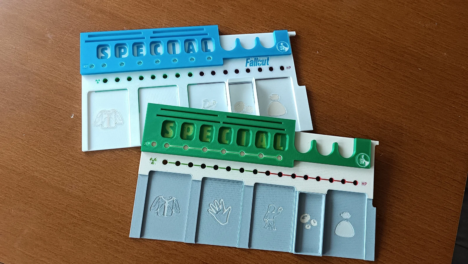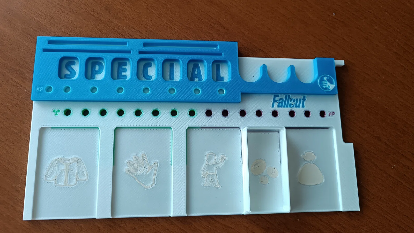Là một fan của series game Fallout, mình không thể bỏ lỡ bản board game. Tuy nhiên, món được dùng nhiều nhất trong game là Pipboy của người chơi lại chỉ làm bằng bìa carton. Việc liên tục tháo/gắn các chốt cho HP, Rad và XP làm các lỗ bị nở ra, khiến chốt không còn bám chắc. Mình cũng muốn sắp xếp các thành phần game cho gọn gàng để chúng không bị rải khắp pipboy, nên mình thêm các khe để cắm agenda cards, apparels và các món khác. Ngoài ra cũng có khe cho perks và task cards.