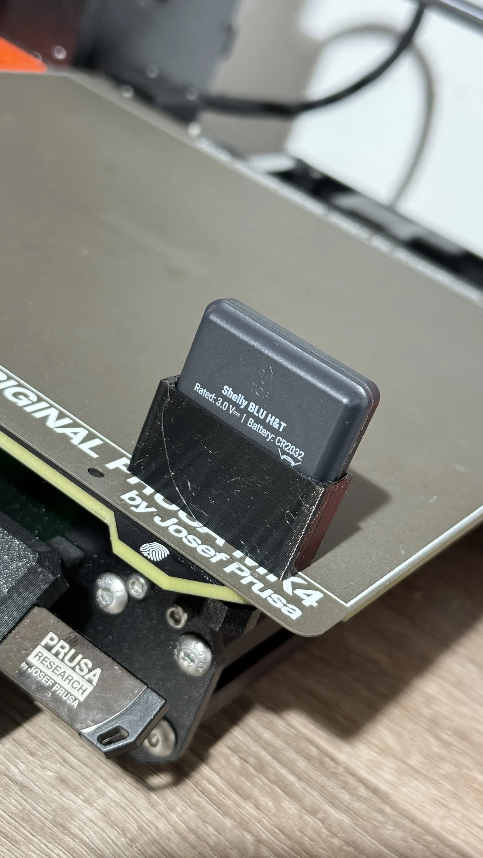 Holder/giá treo tường cho Shelly Blu H&T (cảm biến nhiệt độ/độ ẩm) dùng ngoài trời. Thiết kế để dán bằng băng keo 3M VHB, dễ tháo để thay pin, tránh dính keo lên thiết bị. Có file STL.