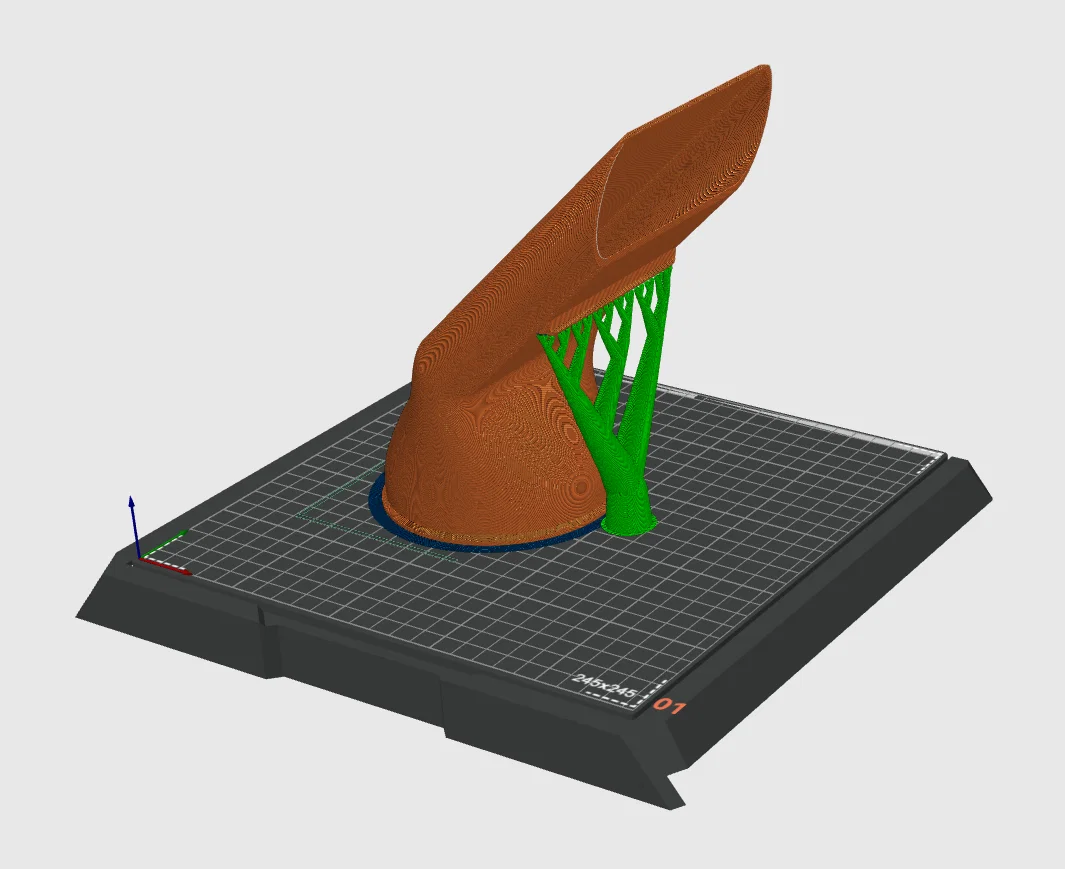 Cần support rất ít. Tất cả file STL đều đã đặt đúng hướng in và không cần supports, ngoại trừ window_exhaust_100mm.stl: khuyến nghị dùng tree supports và chỉ đặt trên build plate (xem hình).
