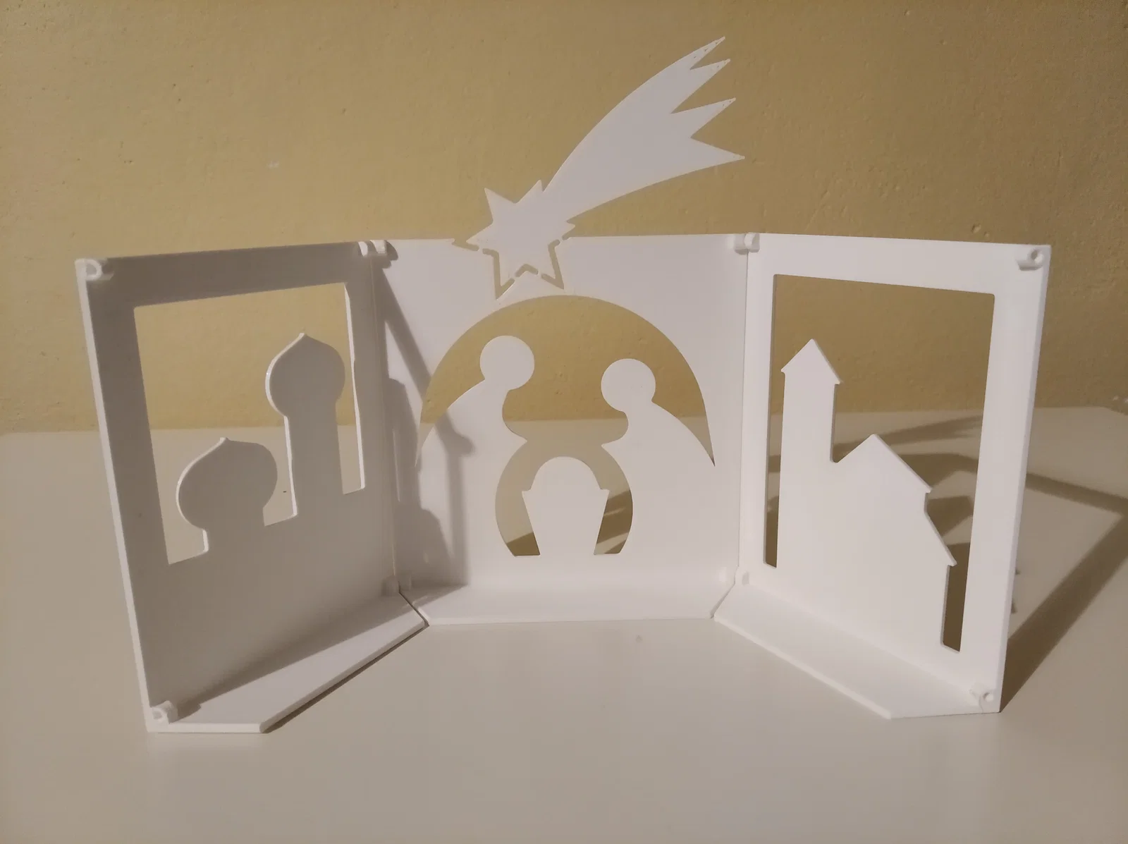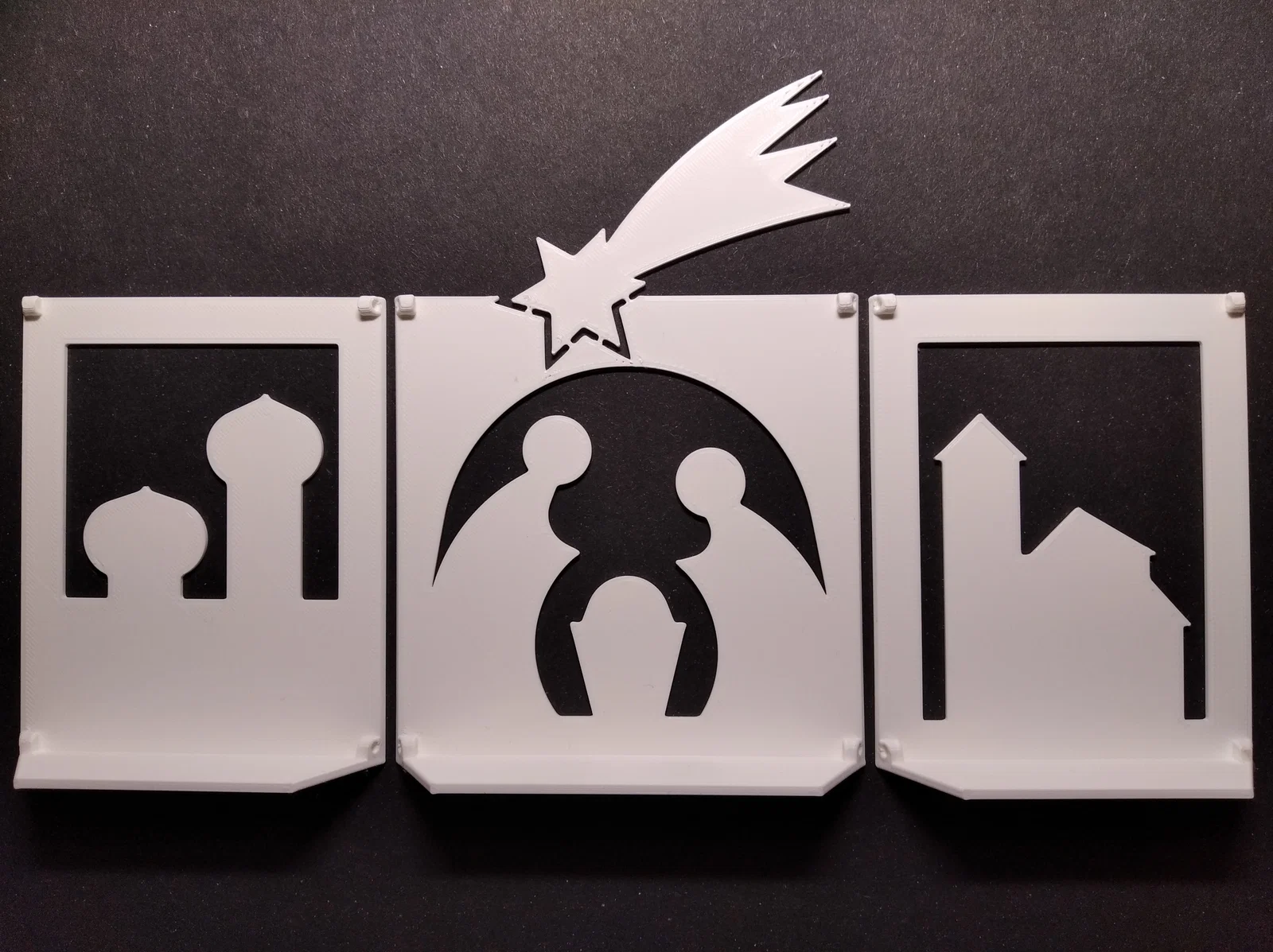 Mô hình Betlém (Nativity scene) dạng bóng đổ với 2 biến thể: Jerusalem nền sau hoặc Ba Vua. Các phần ghép bằng chốt; đặt cách tường ~10 cm và dùng nến tealight để tạo bóng đẹp, chỉnh khoảng cách theo ý.