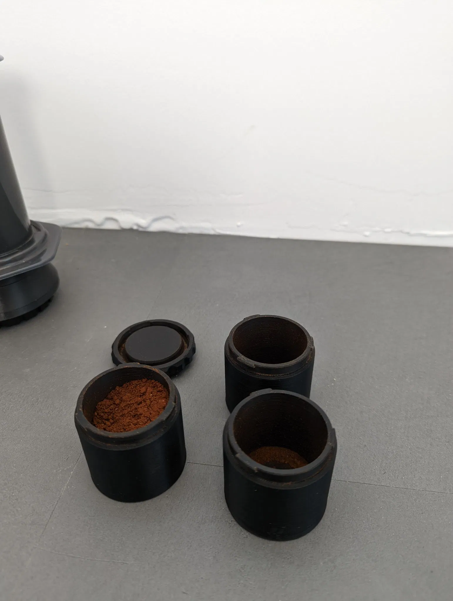 Các ngăn chứa có thể xếp chồng lên nhau bằng một chuyển động vặn đơn giản. Có chỗ cho 3 ngăn trong Aeropress cổ điển. Vì vậy, một bộ 3 ngăn cộng với một nắp là đủ. Các ngăn chứa có thể chứa tối đa 14g cà phê xay, nhiều hơn nếu bạn nén nó bên trong. Tôi thường sử dụng 11g cà phê mỗi lần. Tôi khuyên bạn cũng nên in phần mở rộng Aeropress: để có khả năng vận chuyển hoàn hảo.