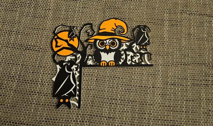 Mẫu trang trí Halloween hình cú gắn góc cửa, thiết kế dễ in và không cần AMS. Gợi ý thông số: 0.16mm layer, 2 walls, 10% infill, thời gian khoảng 2,2 giờ, kèm hướng dẫn đổi màu theo layer.