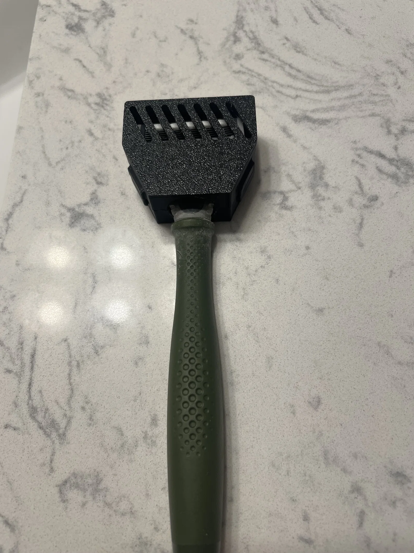 Mình bị mất cái nắp (cover) đi kèm theo cây dao cạo Harrys mới nên thử tự làm một cái. Khi lắp vào thì có hơi rơ một chút, nhưng đóng lại rất chắc. Chắc tới mức đôi khi mở ra cũng hơi khó, nên mình thường luồn móng tay vào dưới một trong các ngàm bấm (snap tabs) rồi cạy lên, nhớ cẩn thận vì lưỡi dao rất bén.