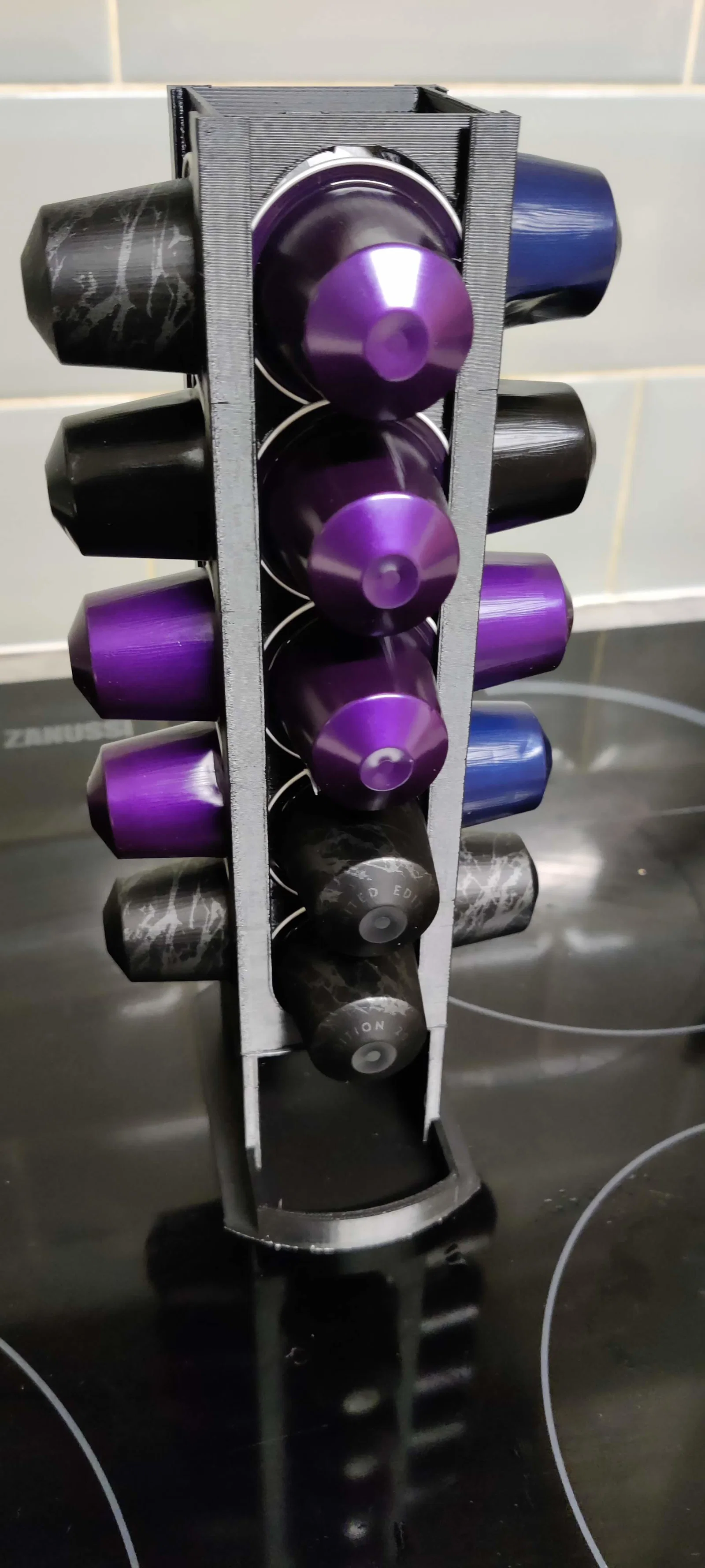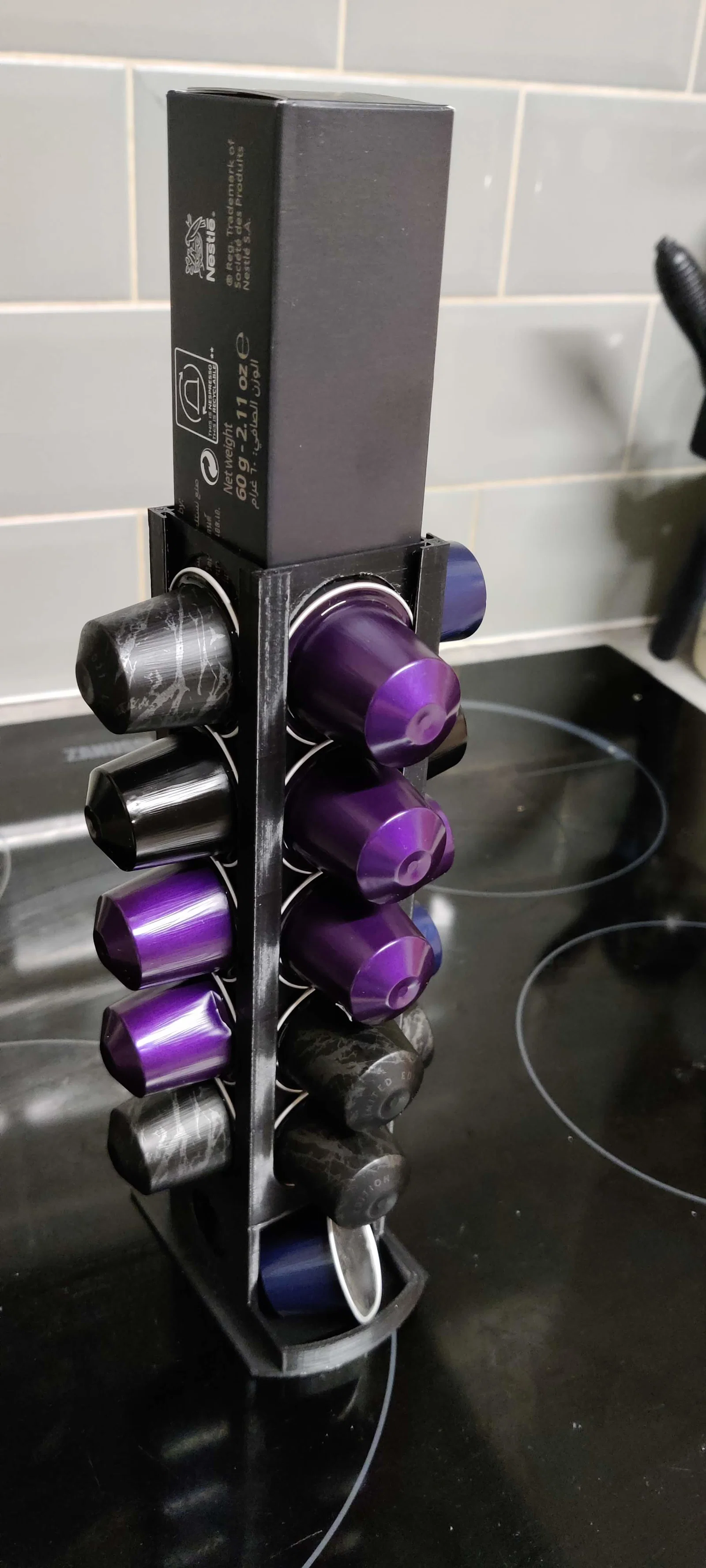 Bản remix của mẫu gốc: trục giữa được tăng để giữ sleeve, có đế mới vững hơn và giúp đẩy capsule ra khỏi sleeve. Thiết kế này chứa được 30 capsule Nespresso, kèm lưu ý in và ráp kiểu friction fit.