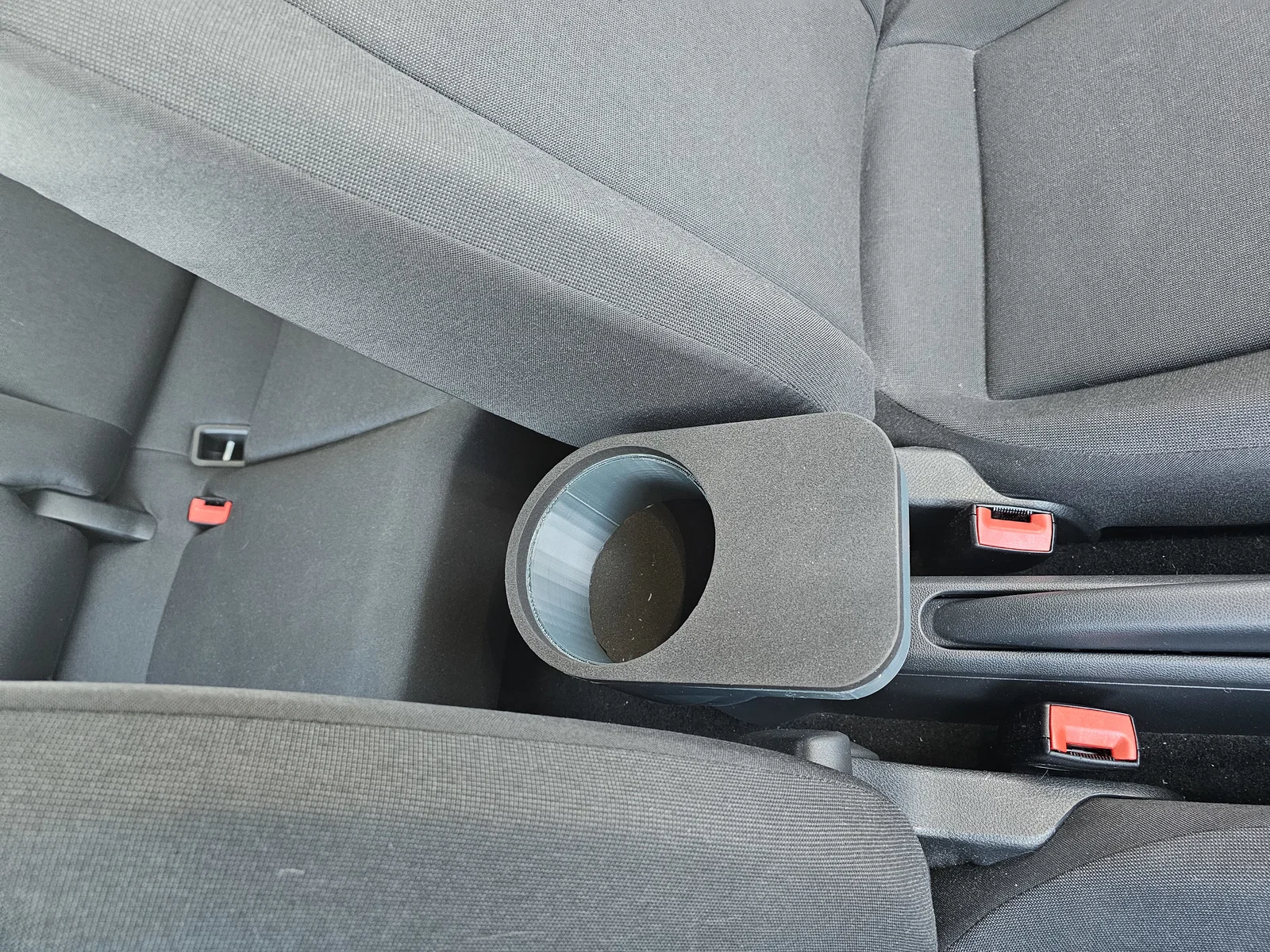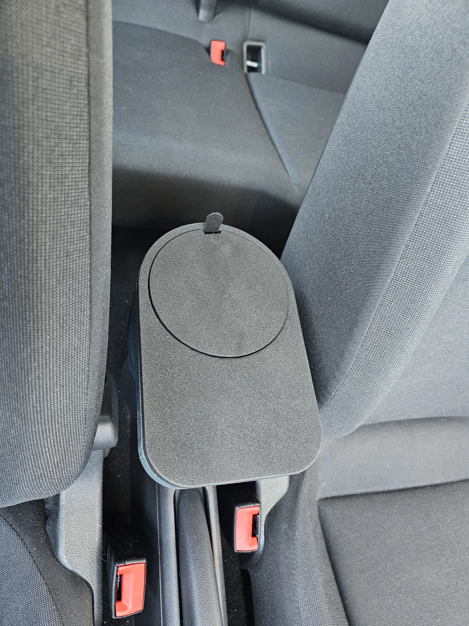 Adapter gắn vào hộc để ly của VW Up để tạo tỳ tay tiện dụng. Có thể bắt vít hoặc dán keo, đã thử lắp vừa. In trên Prusa XL; phần đệm mềm cắt từ miếng mút thợ hồ bằng laser.