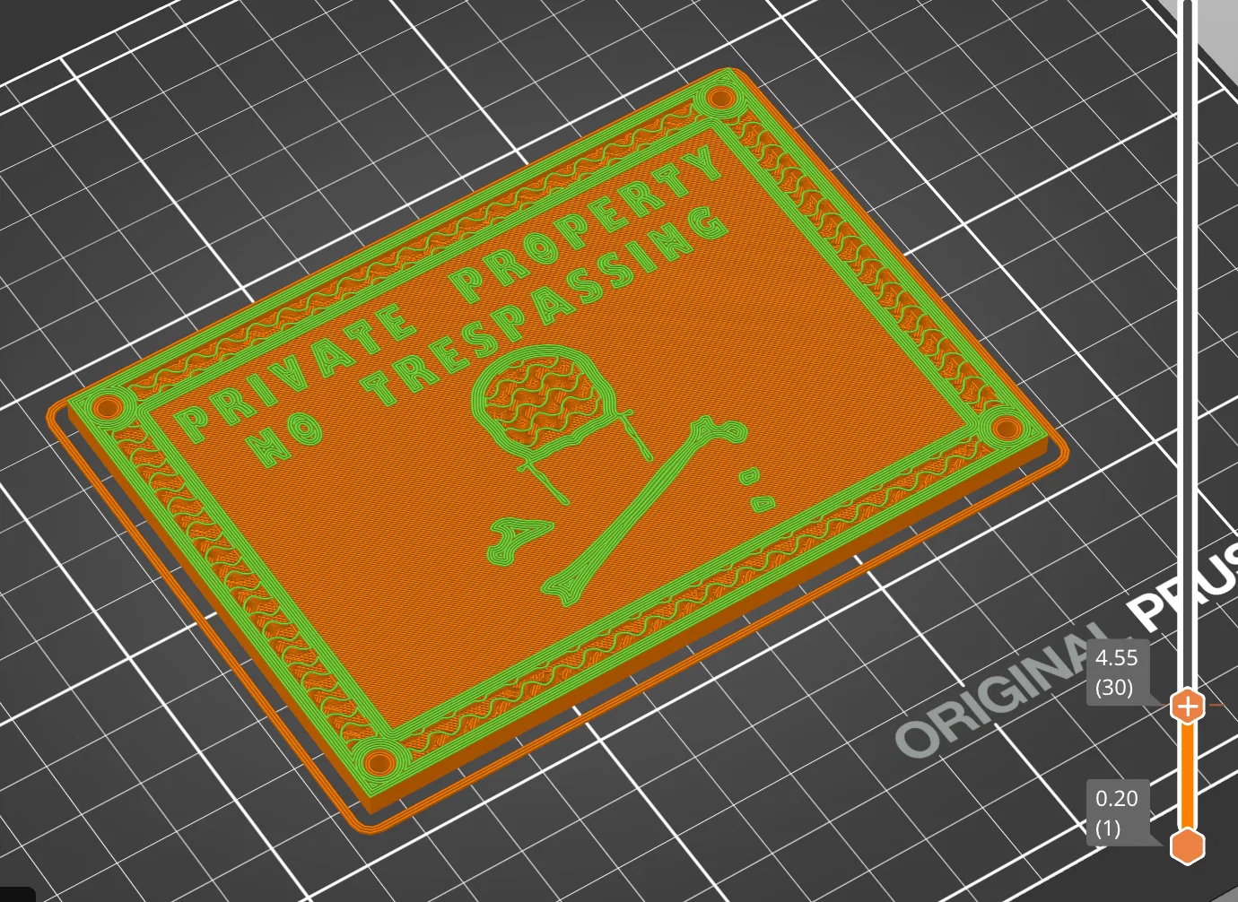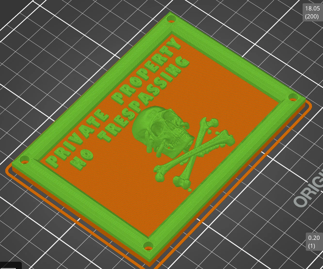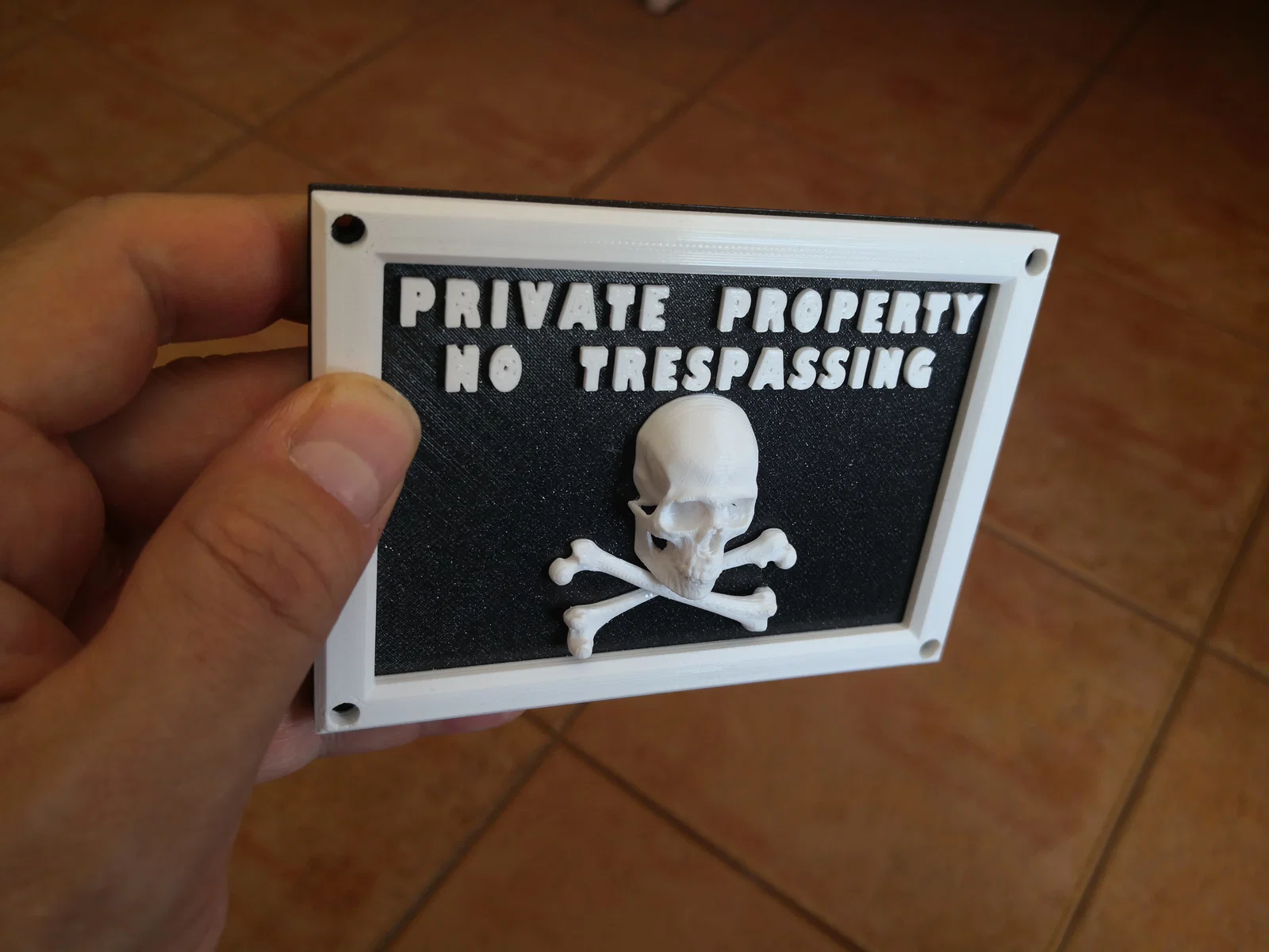 Mẫu bảng cảnh báo “Private Property No Trespassing” có xương người và sọ 3D kèm chữ tiếng Anh. Thiết kế để gắn lên cửa/tủ/bảng, có lỗ bắt bu lông Allen M3, kích thước 120×85×18 mm, dễ scale theo nhu cầu.