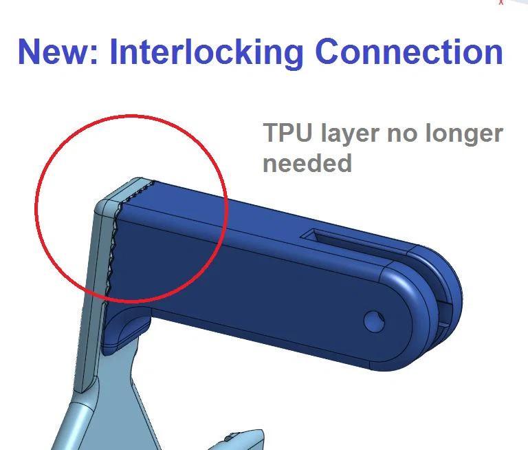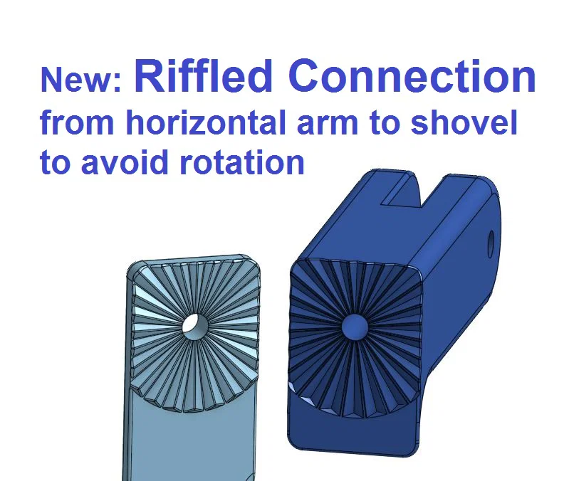 UPDATE 2024-10-10: Theo yêu cầu của @MsSmarttech mình đã thêm phiên bản interlocking cho khớp nối shovel. Phần riffle/khía răng sẽ chặn xoay ngoài ý muốn. Bản ban đầu mình dùng một lớp TPU mỏng để tăng bám, nhưng có riffle thì không cần nữa và mọi thứ có thể in cùng một vật liệu. Theo yêu cầu, mình cũng đưa thêm bản lớn hơn của phần giữ ê-cu dạng knurled.