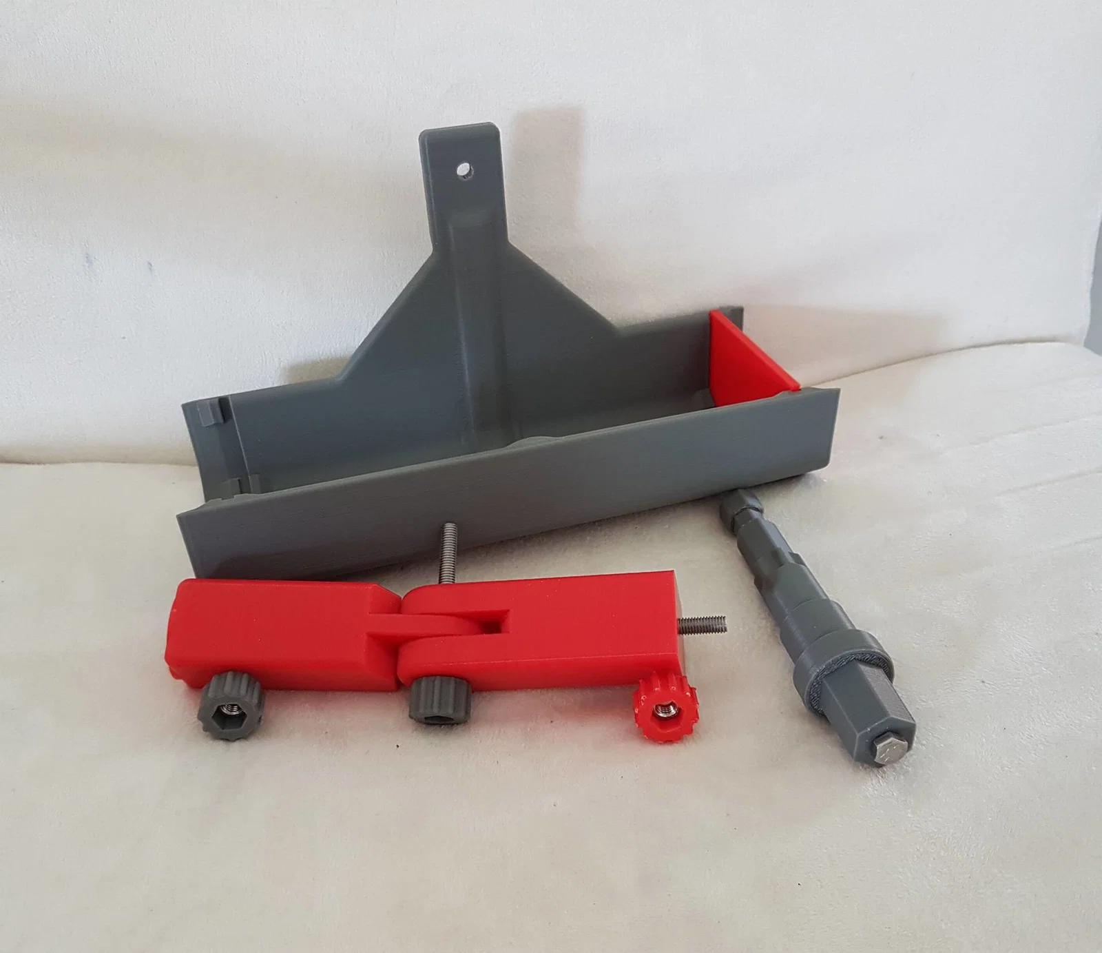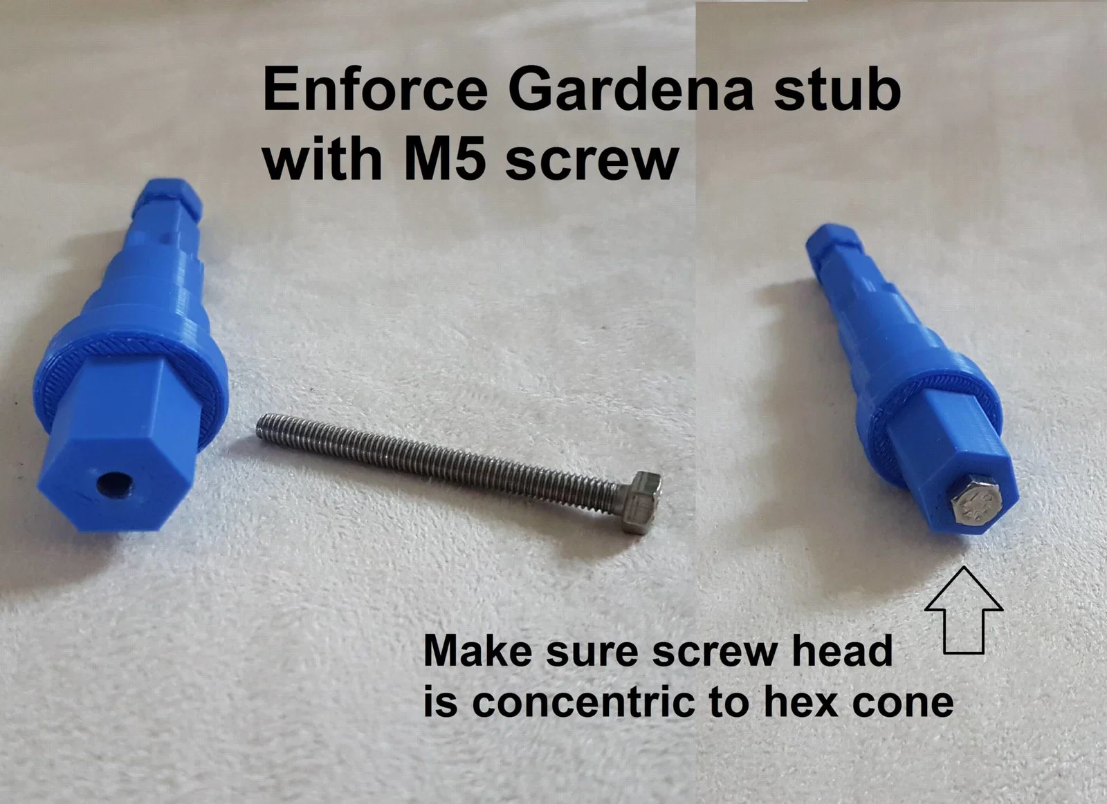Nói về độ vững: mình làm gãy ngay bản in đầu tiên của adapter Gardena, đúng ngay đoạn giữa cán và tay có khớp – chỗ mà lực ngang dễ kéo theo lớp in. Vì vậy con ốc thứ ba chỉ nhằm mục đích gia cường adapter Gardena. Giờ nó có một lỗ ren chặt để vặn vào ốc đầu lục giác (tối đa) M5x50. Phần đầu ốc không quan trọng miễn là không lớn hơn đầu lục giác 8mm (để còn lọt vào lỗ tương ứng trên tay dọc).