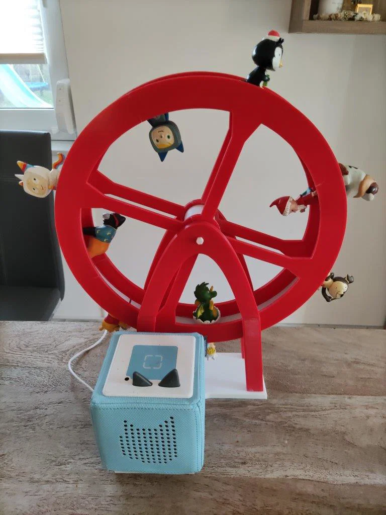 Mẫu Tonie Karussell dùng để cất gọn các tonies. Bản này đã gộp nhiều chi tiết nhỏ thành phần lớn hơn để dễ in hơn, bền hơn; bánh xe chỉ còn 3 phần thay vì 9 và có thể in nguyên đế một lần.