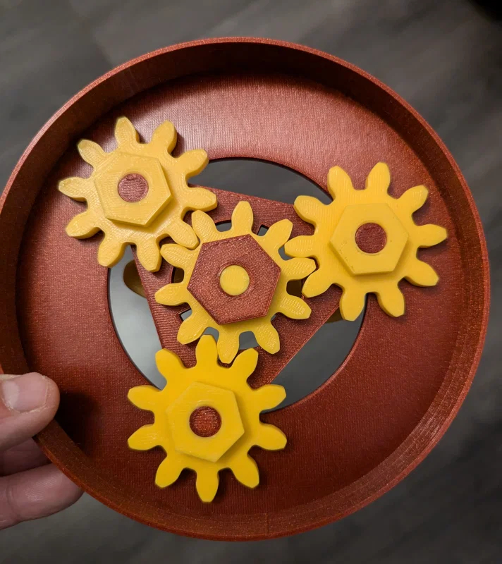 Đặt 3 bánh răng còn lại lên phần đế (file “Base_satelittes”), chúng phải quay trơn, không bị kẹt quanh trục; sau đó gắn 3 con ốc (nut) giống nhau (file “Ecrou_d10_satelittes”) để chúng không bị rơi ra.