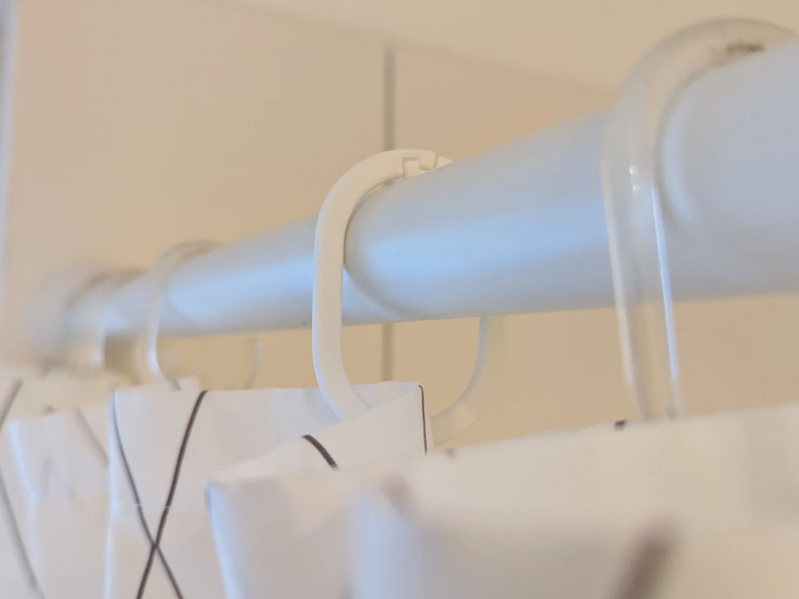 Mình thấy trên hình ở Amazon có hãng quảng cáo sản phẩm của họ bẻ mở ra được để lắp qua một thanh treo rèm đang đóng kín. Mấy cái móc đang treo rèm nhà tắm của mình chắc theo thời gian cũng giòn đi, nhưng nhiều khả năng sẽ không sống nổi nếu bẻ. Mình cũng không muốn tháo lắp gì hết, nên mục tiêu là đảm bảo bẻ mở được. Cái này làm dễ thôi: đặt khe hở ở vị trí có mô-men lớn nhất, tức là trên cùng hoặc dưới cùng.