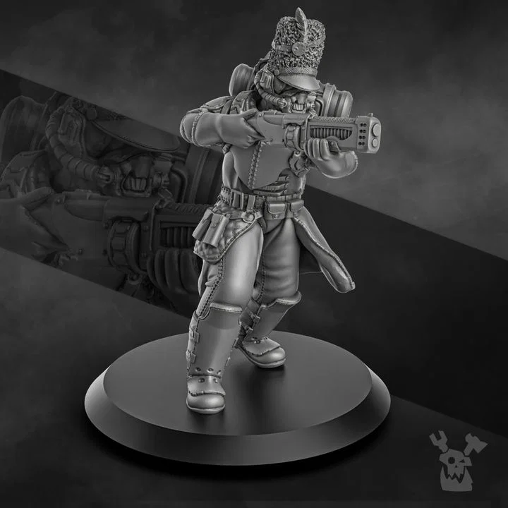 Steam Guard Soldier gồm 4 phần, được scale chuẩn 28 mm cho tabletop. File có 2 bản pre-supported và unsupported, đã chuẩn bị và test để in 3D; khuyến nghị in resin. Dùng thương mại chỉ khi có license.