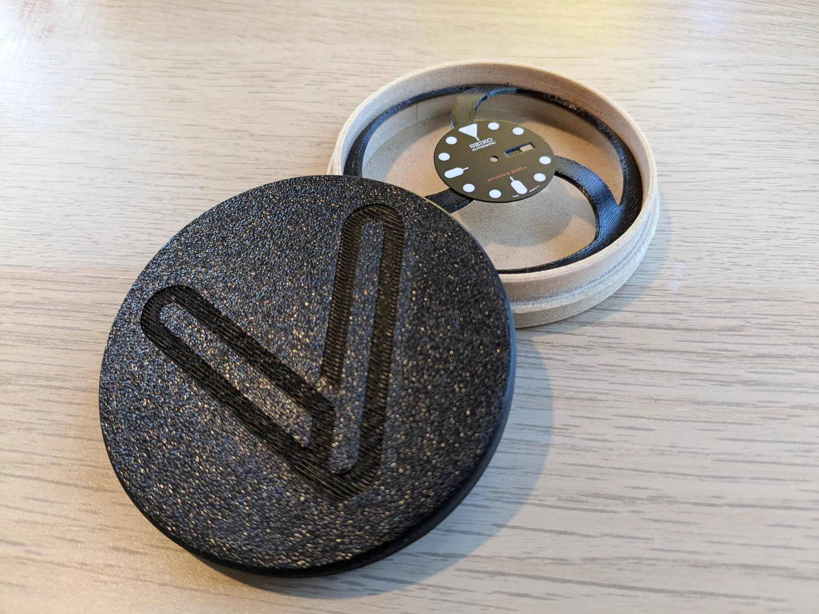 Khi muốn dùng hộp, bạn có thể đặt mặt dial lên nắp, canh nó vào pinion rồi đóng lại; hoặc chỉ cần canh dial cho đúng tâm trên phần TPU rồi đậy nắp lên.