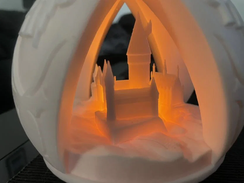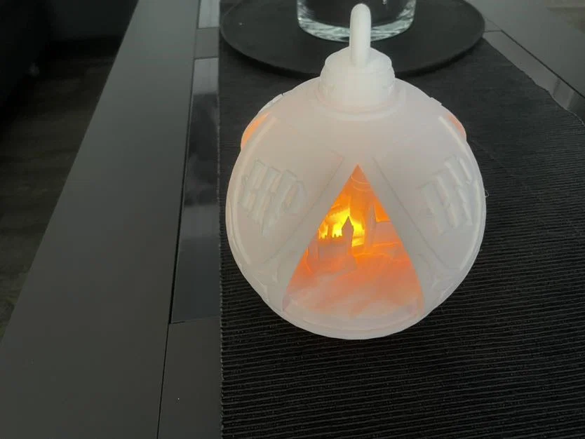 Quả châu Noel chủ đề Harry Potter có khoét chỗ để đặt LED tealight. In được không cần support; chỉ cần keo để dán các chốt cố định và ghép phần trên/dưới. Mẫu được chỉnh cho loại tealight sạc USB-C.