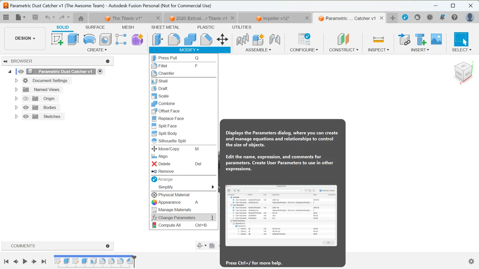 Bạn sẽ thấy một bảng gồm tên tham số và biểu thức (expression) tương ứng. Đây là những mục bạn chỉnh nếu muốn lỗ lớn hơn hoặc khay hứng bụi to hơn.