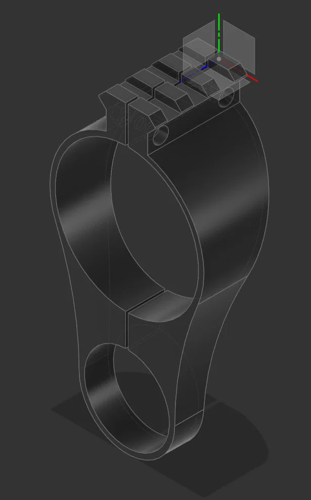 Ngàm Picatinny thiết kế cho Umarex Notos dùng huben regular/drop block và bình .22L (bình 54mm, nòng 32mm). Kẹp bằng 2 ốc 3mm cap socket và đai ốc 3mm nyloc. Có thêm file STEP cho bình 61mm (chưa test).