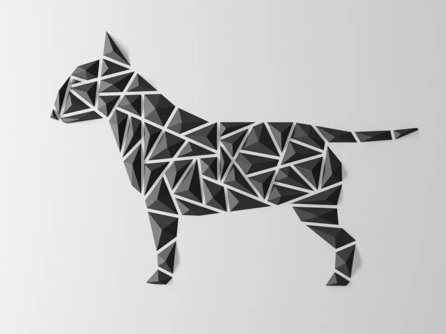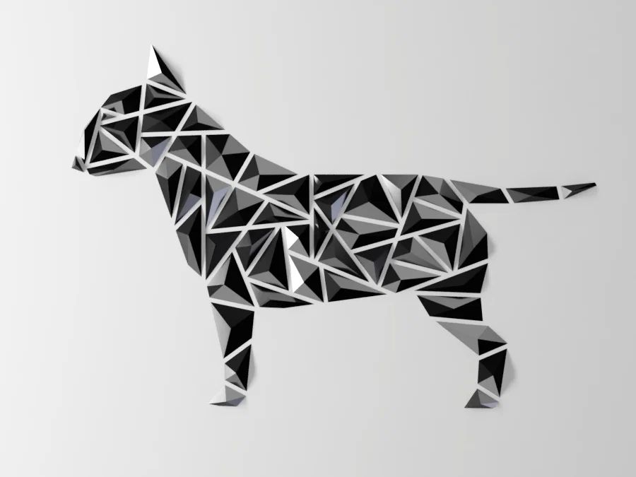 Mẫu wall art chó hình học phong cách Bull Terrier, thiết kế để in kích thước lớn trên máy in 3D tiêu chuẩn. Kích thước mặc định khoảng 130×90 cm, gồm 55 mảnh có đánh số, kèm file PDF paper mask để canh dán lên tường.