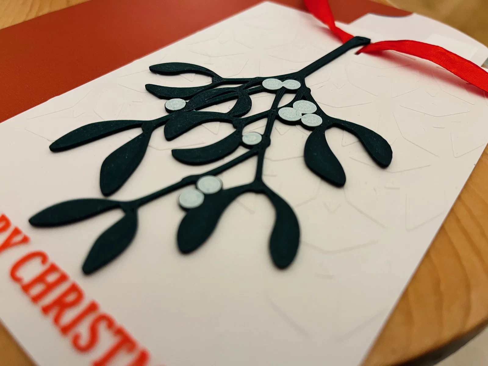 - Thiết kế 2 trong 1: Kết hợp thiệp chúc mừng "Merry Christmas" và phụ kiện trang trí hình cành tầm gửi truyền thống.