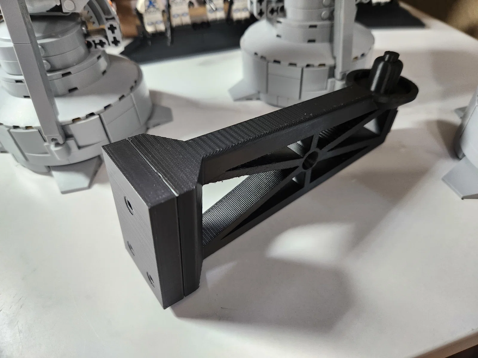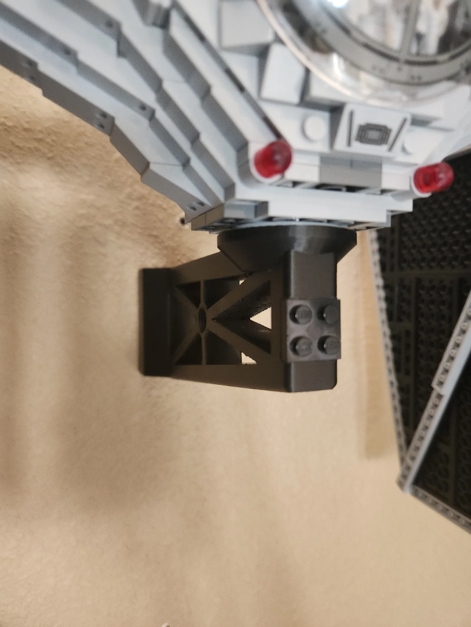 Ngàm treo tường thiết kế trên Onshape để trưng bày Lego Tie Fighter UCS 75095 mà không cần sửa mô hình. Dáng nêm che lỗ vít cho gọn, có chỗ nêm gạch 2x2 để gắn plaque; bản file đẩy tàu ra xa tường thêm 1mm.