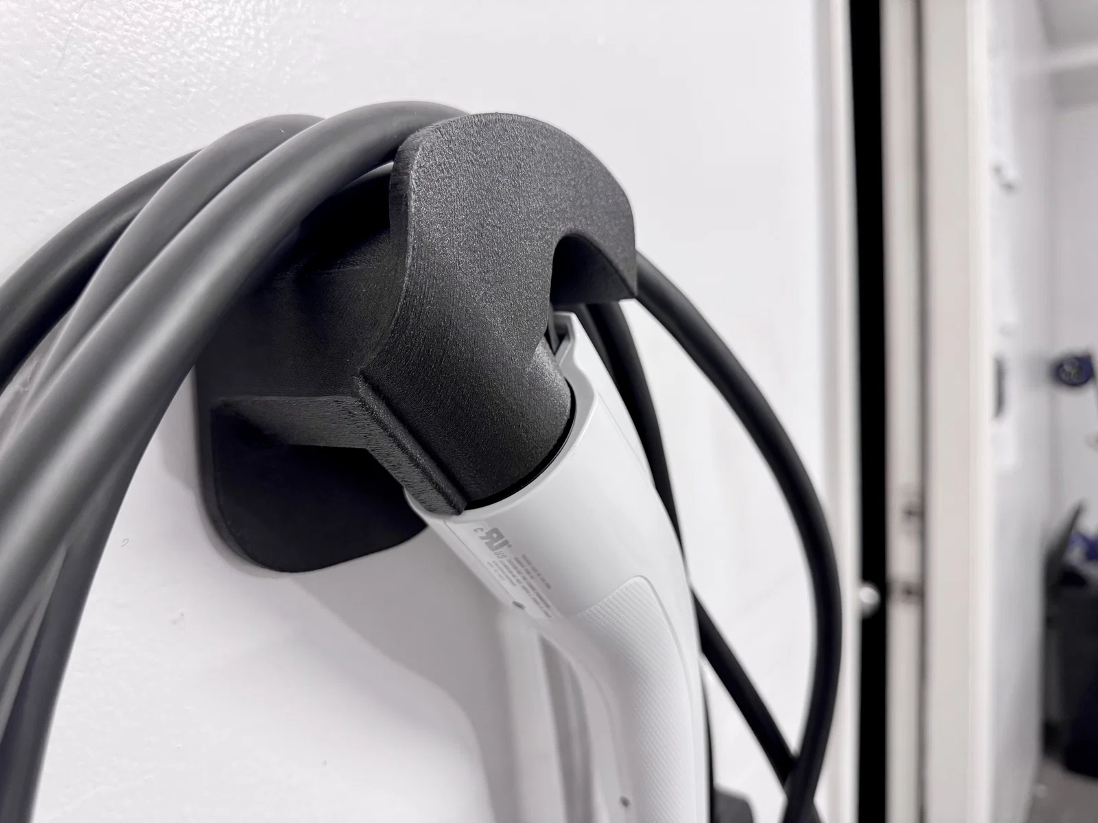 Giá treo tường low-profile cho đầu cắm J1772, nhô ra <76 mm, dễ cắm đầu 90° góc chúc 45°. Có hốc dán Command Strips/VHB, vách giữ dây cao hơn, góc bo tròn đẹp và gần như không cần support khi in.