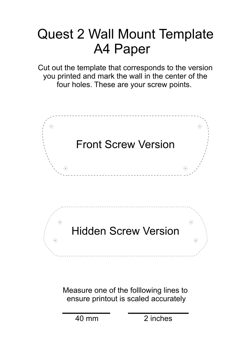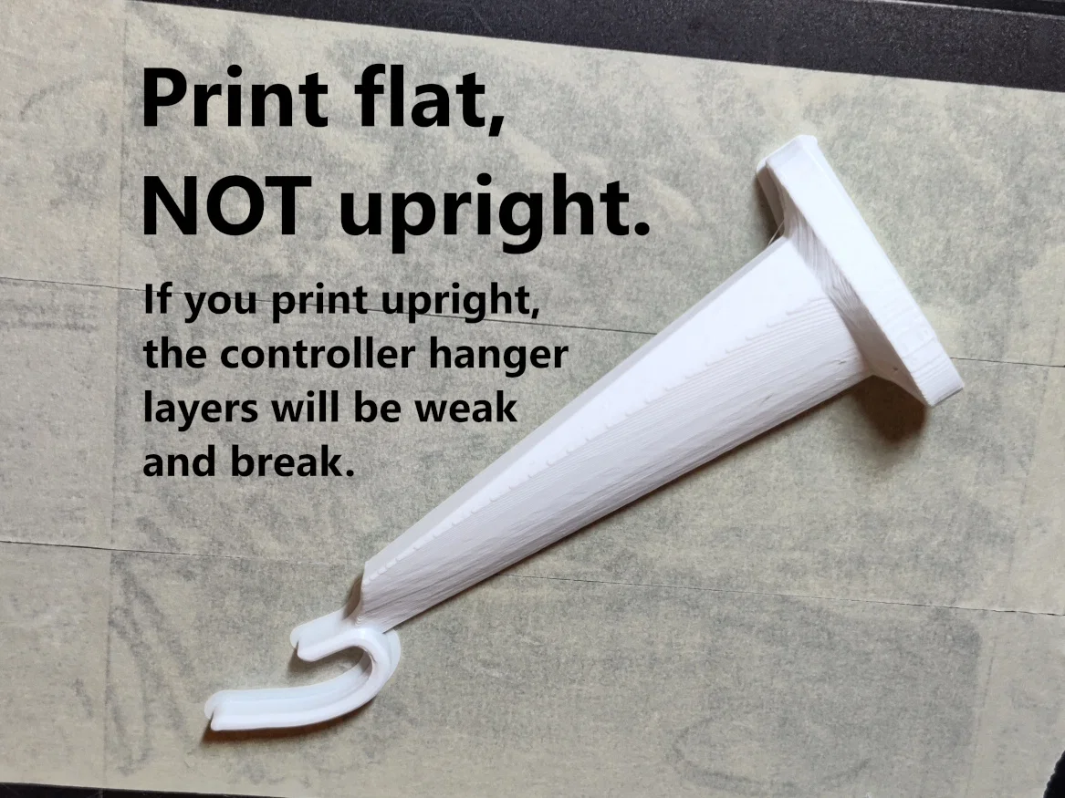 -1. Chọn bạn muốn bản Front-Screw hay Hidden-Screw. Xem video phía trên để so sánh. Bản Front-Screw dễ lắp hơn nhiều và dùng được với vít có đầu lớn hơn. Bản Hidden-Screw nhìn “ngầu” hơn. Tải file bên trái và bên phải. Tên file sẽ bắt đầu bằng FrontScrews hoặc HiddenScrews tùy phiên bản bạn chọn. -2. Tải template tương ứng -- bản in 3D hoặc bản giấy. Mình rất khuyến nghị dùng template in 3D. In rất nhanh, và bạn có thể đặt thước thủy (level) lên trên. (Template_3DPrint_FrontScrews.stl hoặc Template_3DPrint_HiddenScrews.stl.) Nếu bạn dùng template giấy, tải Template_Paper_A4.png hoặc Template_Paper_Letter.png. Template cho bản front-screw và hidden-screw nằm trên cùng một tờ giấy. Nhớ in ở chế độ “actual size” và đo lại thước tỷ lệ để đảm bảo đúng kích thước. -3. In các file. Không cần support. Đảm bảo in đúng theo hướng file đã xoay sẵn. KHÔNG in dựng đứng phần mount -- đầu móc controller sẽ bị gãy. Mình khuyên dùng brim cho phần mount. -4. Nếu bạn in bản Hidden-Screw, tháo các tower supports khỏi lỗ vít. (Những support này được nhúng sẵn trong thiết kế.) -5. Dùng template để canh thăng bằng và đánh dấu vị trí bắt vít trên tường. Sau bước này bạn không cần template nữa. Nó không phải là một phần của thiết kế. -6. Xem video để biết thêm hướng dẫn, đặc biệt nếu bạn in bản Hidden-Screw.
