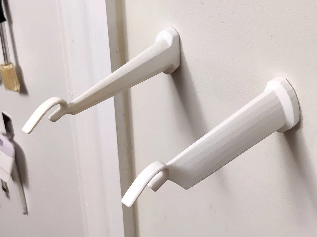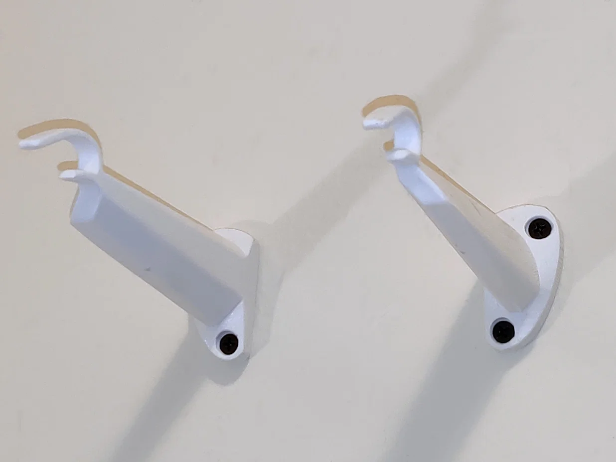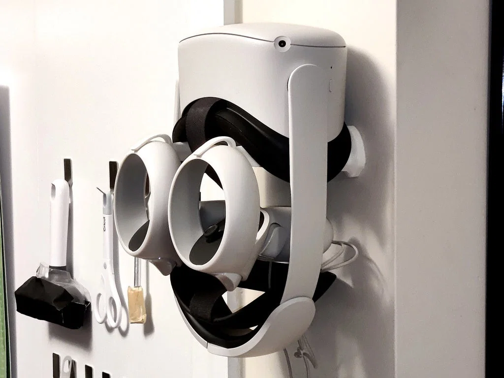 Mình không tìm được cái móc treo tường Meta Quest 2 nào ưng ý, nên tự làm một cái. Nó dùng được với cả Elite strap lẫn dây đeo thường. Cái móc này cũng dùng được cho Quest 1 đời đầu.