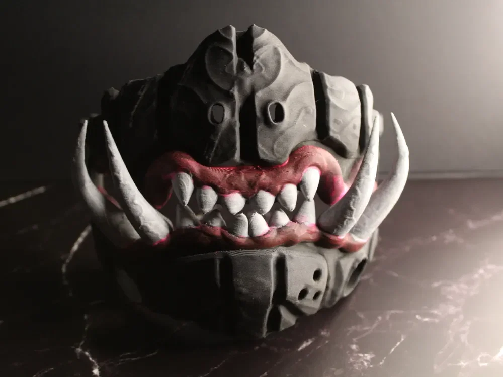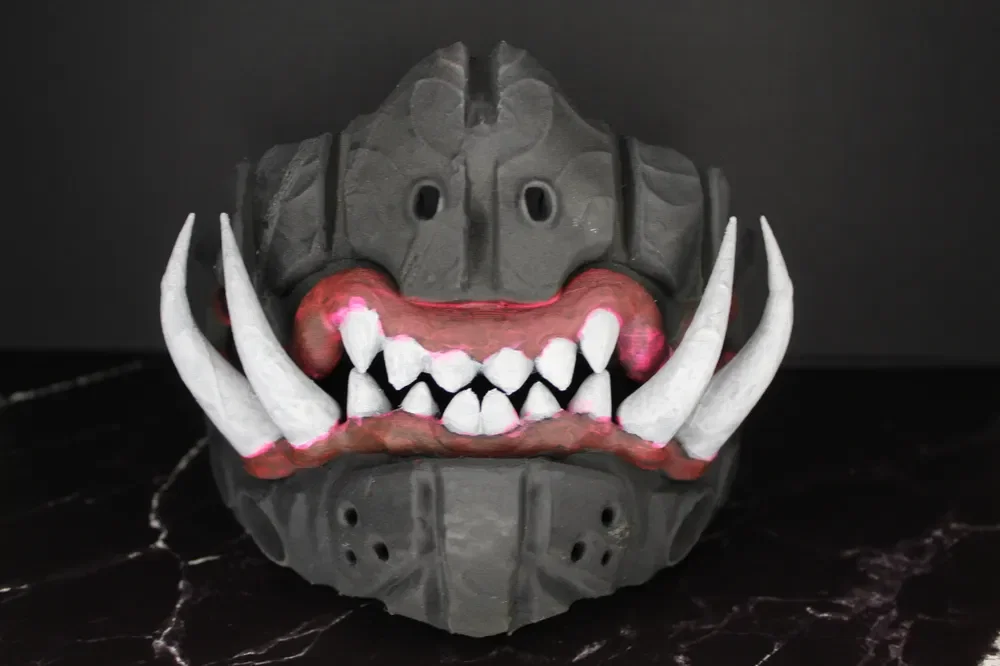 Sản phẩm này được tạo ra dành riêng cho những tín đồ yêu thích văn hóa cosplay, samurai hoặc những ai muốn sở hữu một vật phẩm decor 3D ấn tượng trên bàn làm việc. Với thiết kế half-mask (bán mặt), mặt nạ tập trung chủ yếu vào phần miệng và xương hàm, giúp người đeo vẫn giữ được sự linh hoạt khi di chuyển hoặc tham gia các sự kiện kéo dài. Các chi tiết trên mặt nạ được chăm chút kỹ lưỡng, từ phần răng nanh cong vút cho đến kết cấu bề mặt giả cơ khí, tạo nên một chiều sâu thị giác cực kỳ bắt mắt khi bạn phủ lên một lớp sơn phù hợp.