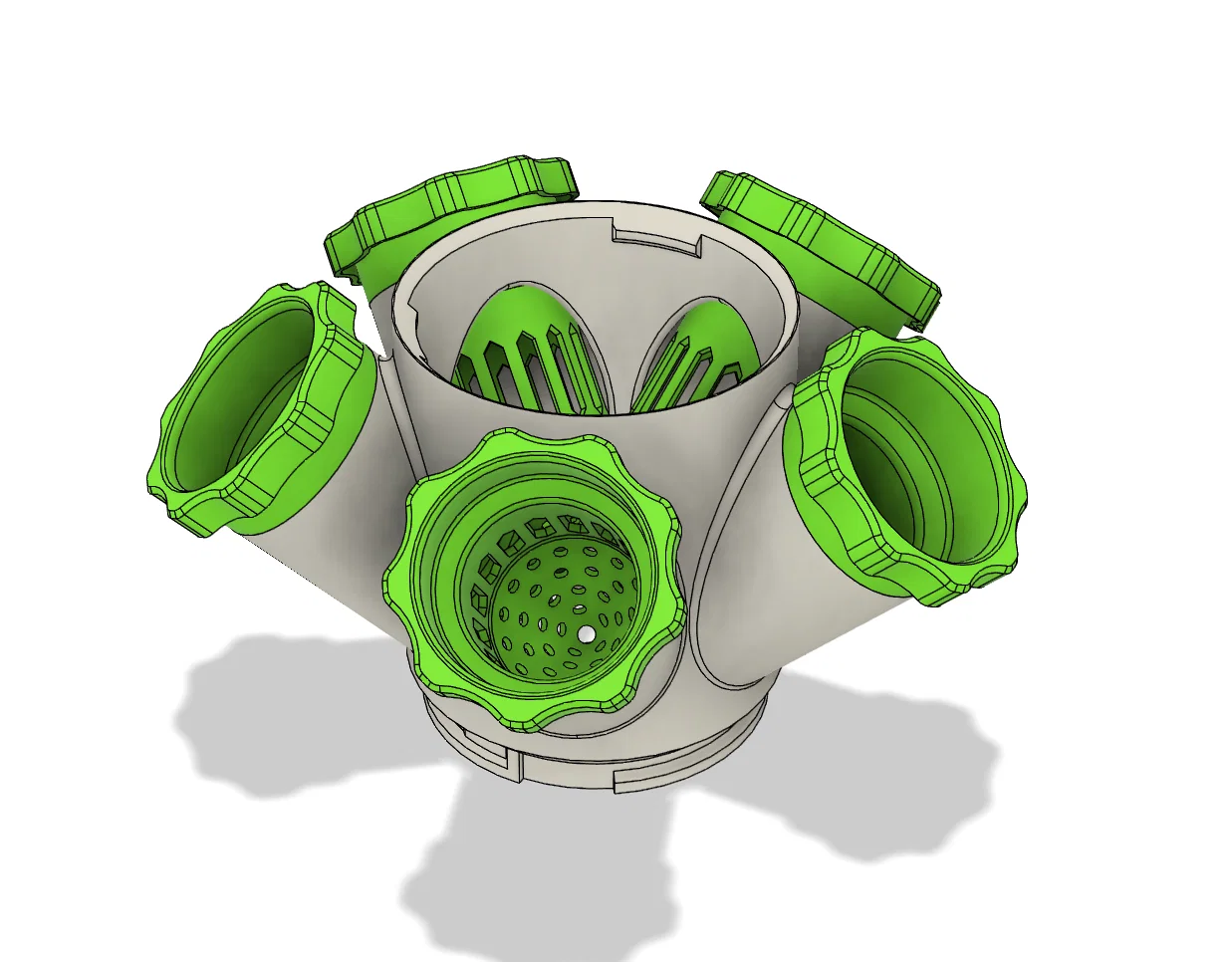 Bản remix cải tiến cho Modular Hydroponic Tower Garden: nâng cấp chậu tiêu chuẩn và module 5-way, net cup lớn hơn, lỗ thoáng hơn và spoke 5 hướng giúp nước phân đều, hợp trồng herbs/cây nhỏ.