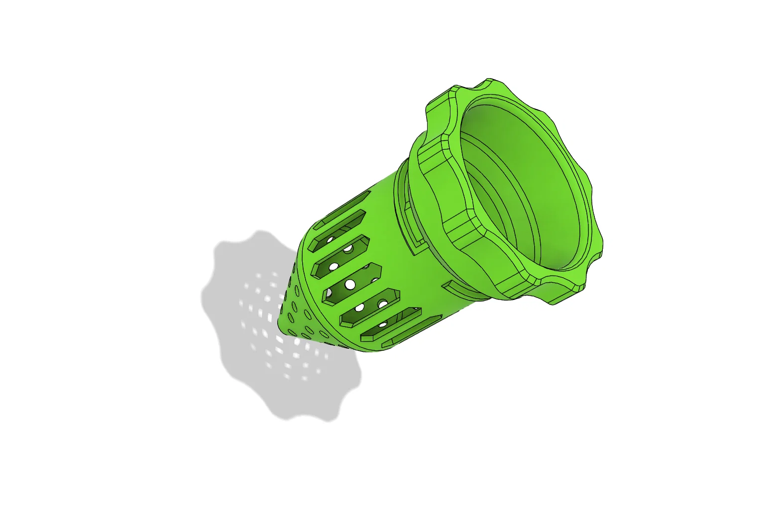Mình nới rộng net cup để nó khớp chiều cao với bản size tiêu chuẩn của phiên bản 3-way — nhờ vậy tăng được chút thể tích và hứng được nhiều nước hơn khi nước nhỏ xuống phần tâm ở giữa. Góc nghiêng cũng chỉnh khác đi một chút để các chậu không bị cấn nhau, và các lỗ cũng lớn hơn so với bản gốc (5,75 đến 5 mm thay vì cố định 4 mm).