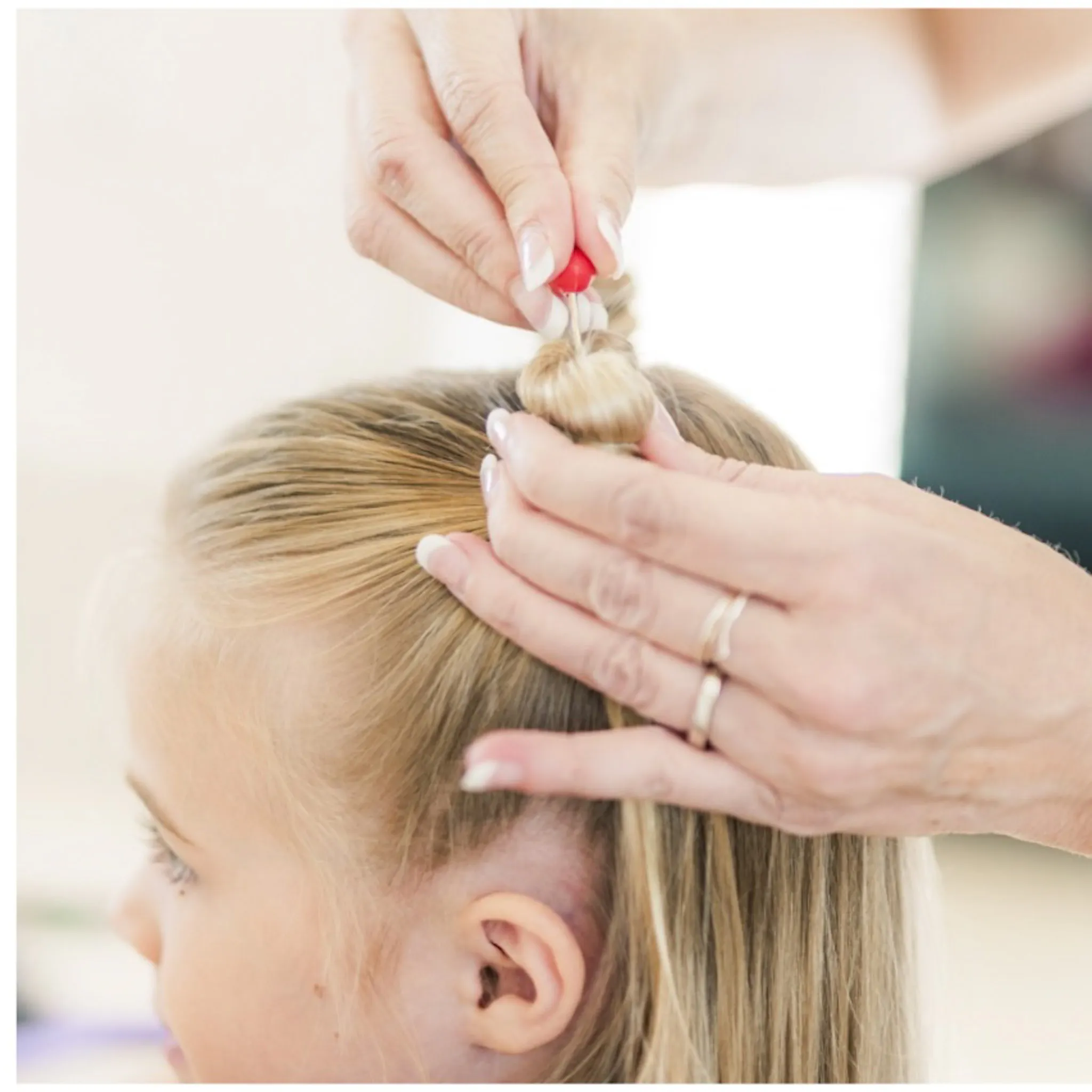 Để thêm các phụ kiện vào tóc, hãy tạo một búi tóc không gian, đặt một dây thun nhỏ quanh các móc ở phía sau kem ốc quế, và sau đó kéo dây thun quanh búi tóc không gian. Hoàn thành bằng cách chèn ghim tóc cherry xuống giữa búi tóc.
