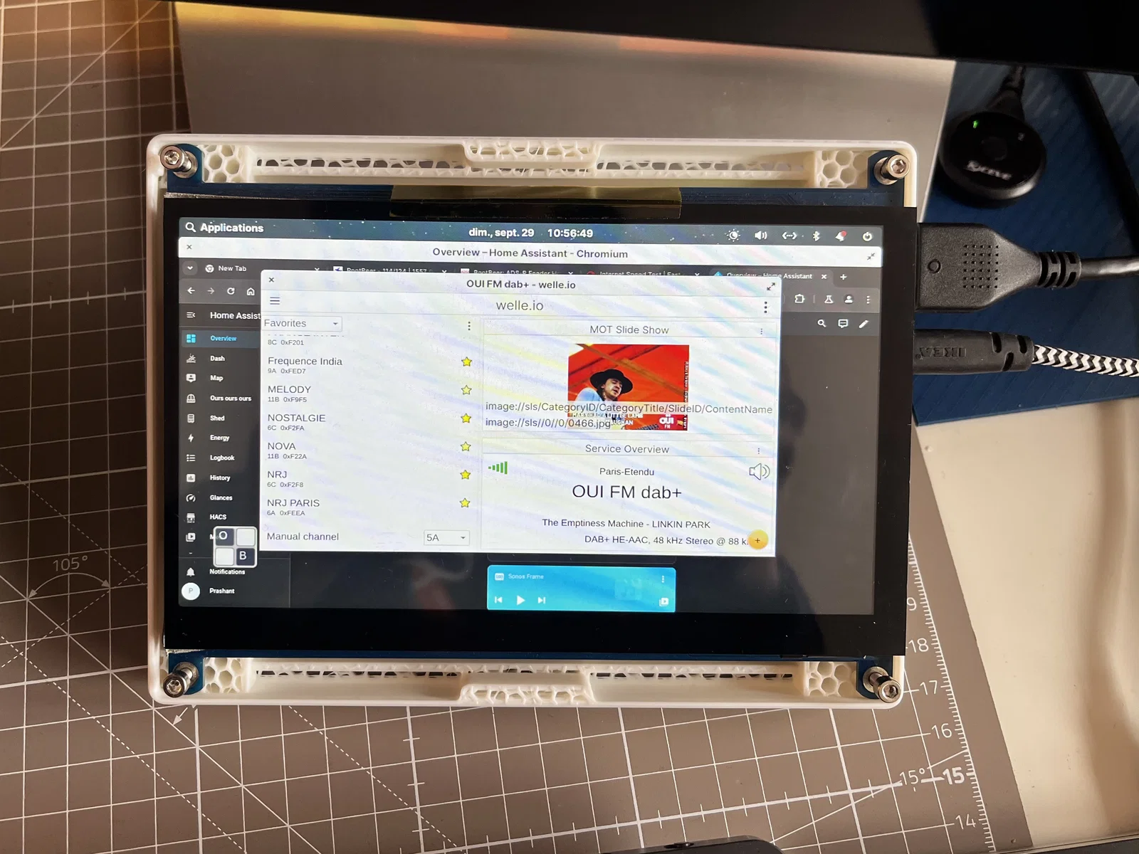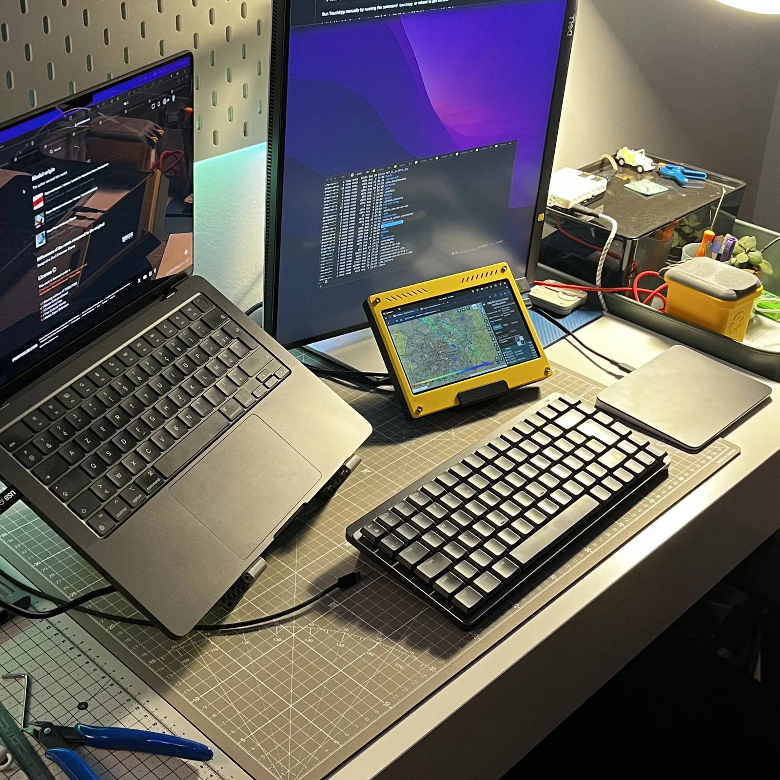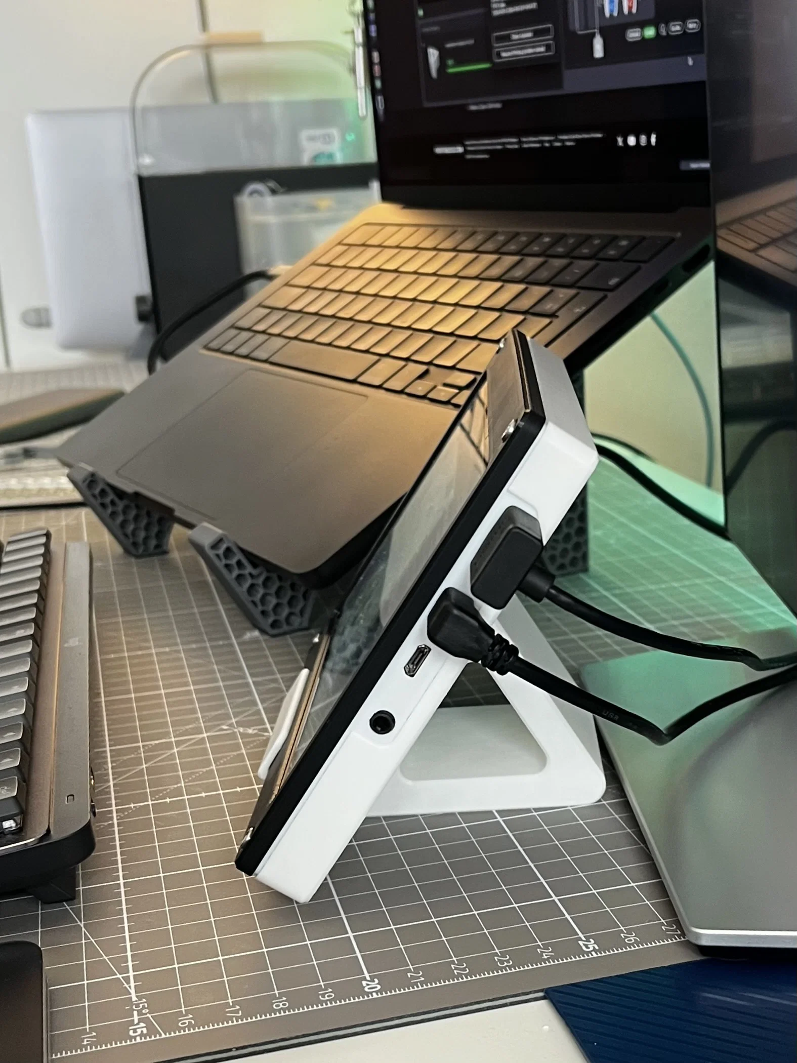Trước đây mình treo cái màn này lên Skadis, nhưng giờ phải tháo xuống. Mẫu này được thiết kế để dùng màn hình như một touchscreen trên bàn. Phần vỏ màn hình và dock/đế là tách rời, nên bạn có thể dễ dàng in một dock khác để đổi góc nghiêng theo ý.