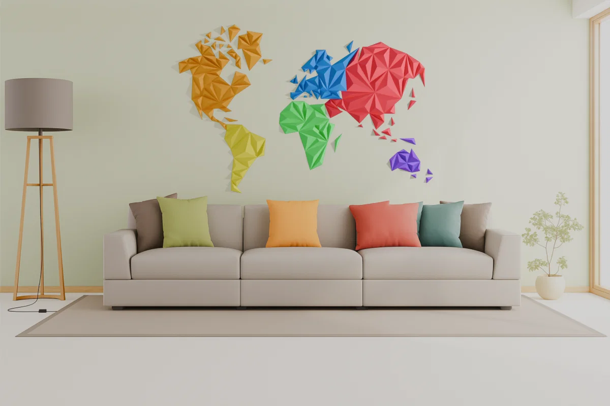 Mẫu bản đồ thế giới kiểu geometric/low poly dạng treo tường, đã resize để in được khổ lớn trên máy in 3D tiêu chuẩn. Kích thước mặc định khoảng 150×90 cm, gồm 167 mảnh có đánh số mặt sau để dễ ghép.