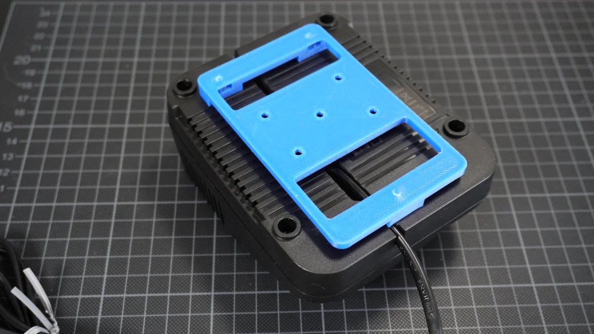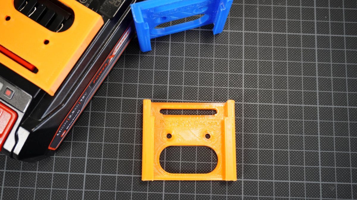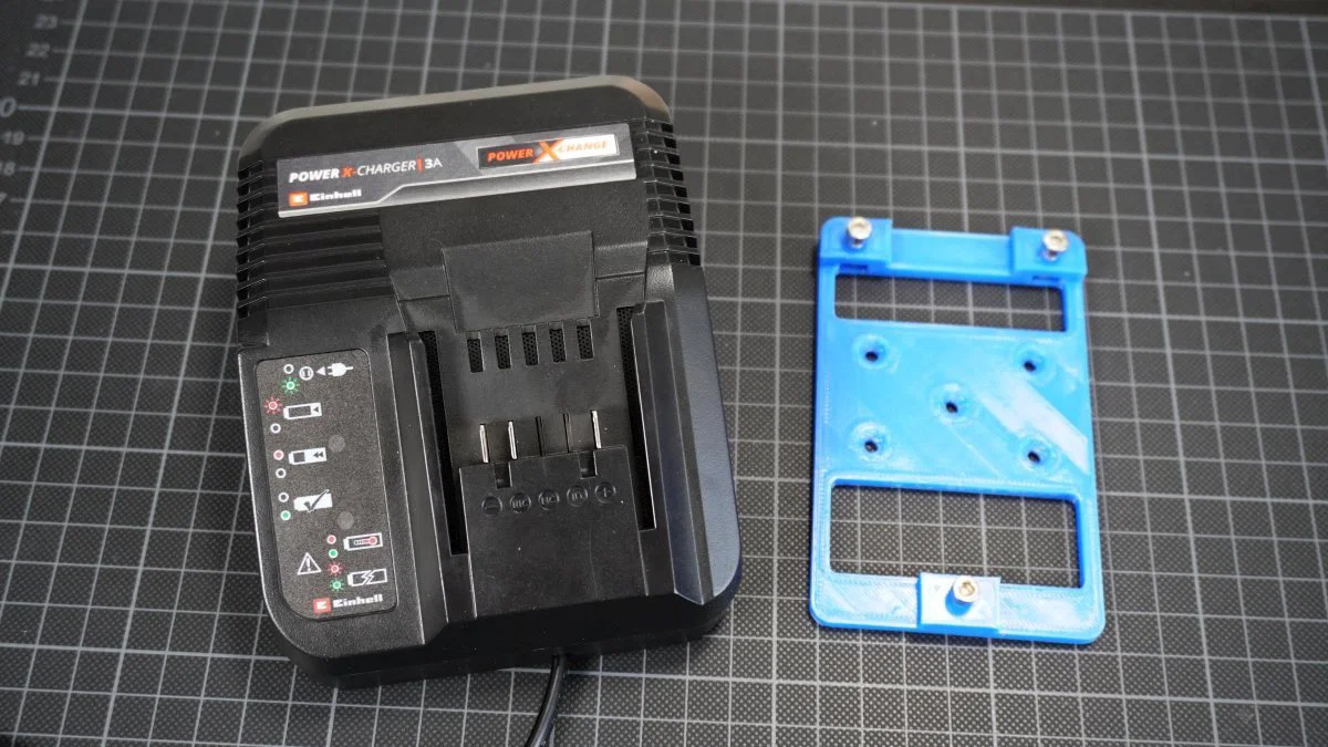 Bộ giá treo cho pin Li Einhell Power X Change (PXC) dùng gắn tường hoặc treo ngược, kèm gá lắp trạm sạc Power X Charger 3A. Infill 15%, không cần supports; cần vít M4x10, đai ốc M4 và vít 3x16mm.