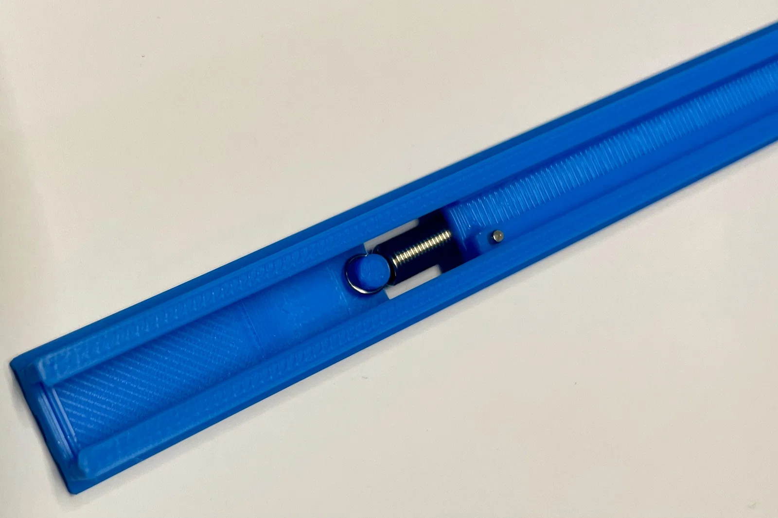 Lắp ráp chỉ cần gắn lò xo. Đặt outer guide rail xuống bàn, móc một vòng lò xo vào pin và để phần thân lò xo nằm trong khe mở phía dưới. Sau đó đưa slider vào đến chỗ lò xo, canh lò xo nằm giữa để rãnh lõm phía dưới của slider trượt qua lò xo, rồi đẩy slider vào hết. Bước tiếp theo hơi lắt nhắt: khi lật feeder, lò xo có thể tuột khỏi pin và phải làm lại. Cách tốt hơn là cầm feeder dựng đứng, để khe mở phía dưới quay về phía mình. Dùng kìm hoặc nhíp kẹp vòng còn lại của lò xo và trượt nó vào pin thứ hai (pin này sẽ thấy được qua khe mở phía dưới).