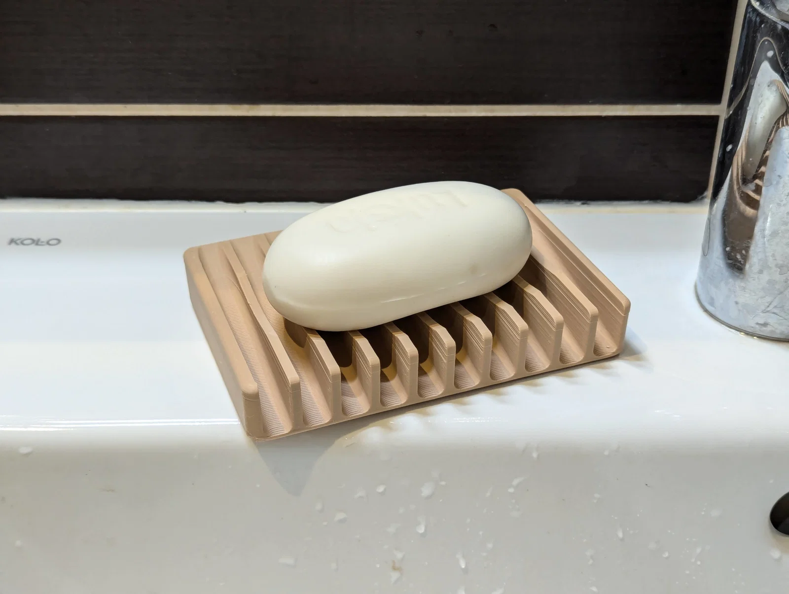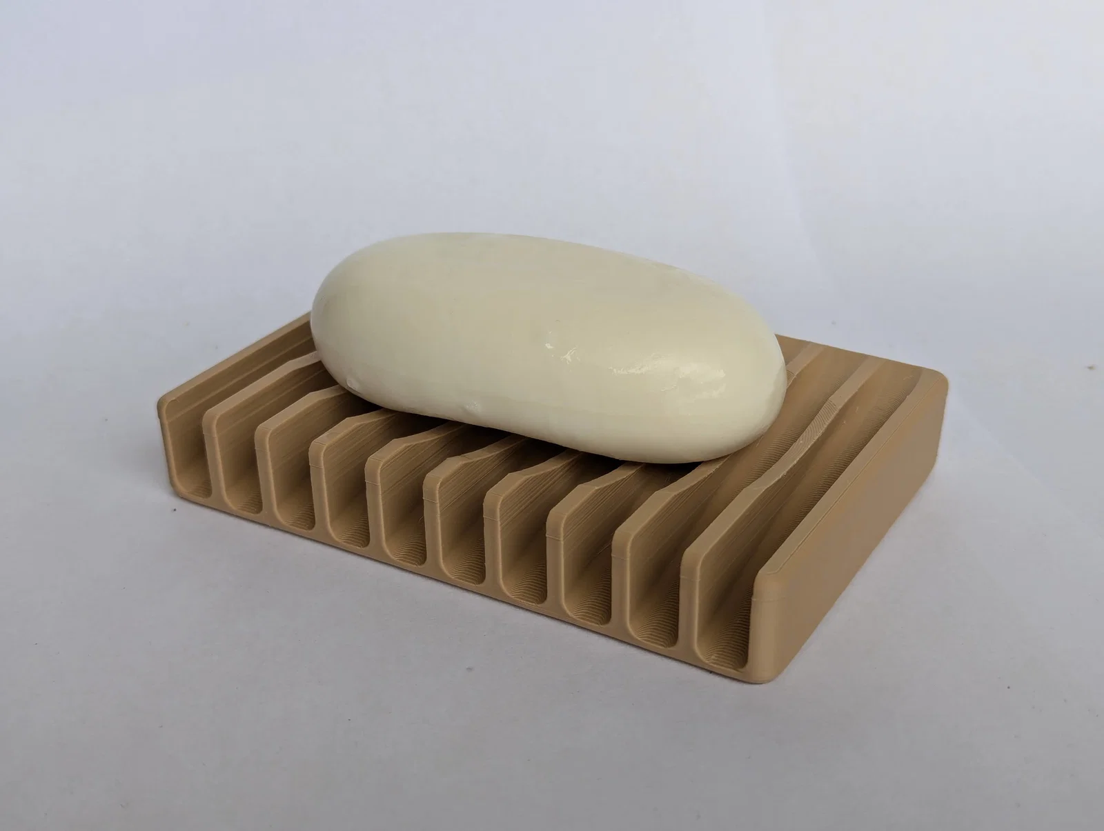 Một mẫu khay để xà phòng giúp xà phòng luôn khô ráo, hạn chế nước đọng và giảm nguy cơ vi khuẩn phát triển. Thiết kế đáy nghiêng cho nước chảy về lại bồn, bề mặt cong giữ xà phòng không bị trượt.